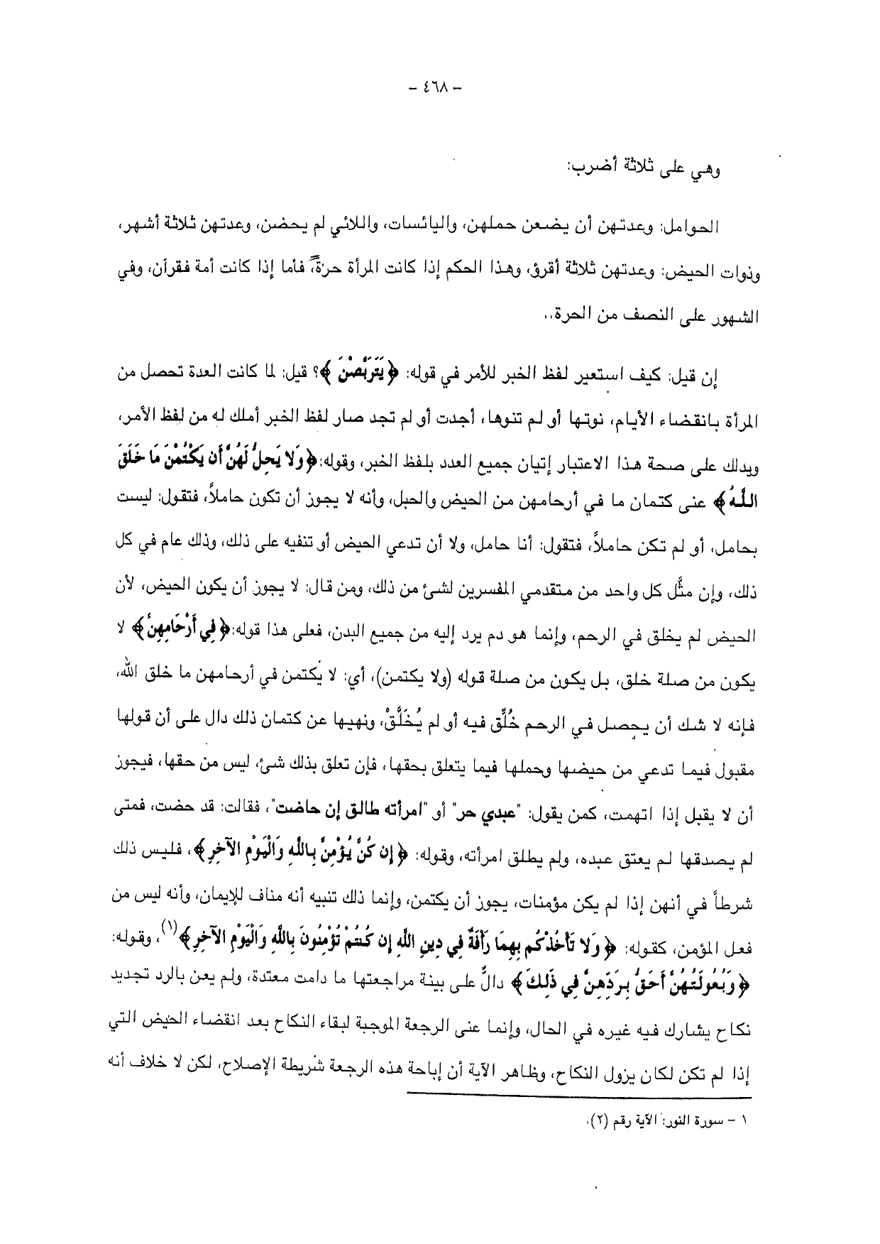 إن قيل: كيف استعير لفمظ الخبر للأمر في قوله: {يَتَرَبَّصْنَ}؟ قيل: لما كانت العدة تحصل من الرأي بانقضاء الأيام، نوتها أو لم تنوها، أجدت أو لم تجد صار لفظ الخبر أملك له من لفظ الأمر، ويدلك على صحة هذا الاعتبار إتيان جميع العدد بلفظ الخبر وقوله: {وَلَا يَحِلُّ لَهُنَّ أَنْ يَكْتُمْنَ مَا خَلَقَ اللَّهُ} عنى كتمان ما في أرحامهن من الحيض والحبل، وأنه لا يجوز أن تكون حاملاً، فتقول: ليست بحامل، أو لم تكن حاملاً، فتقول: أنا حامل، ولا أن تدعي الحيض أو تنفيه على ذلك، وذلك عام في كل ذلك، وإن مثل كل واحد من متقدمي المفسرين لشيء من ذلك، ومن قال: لا يجور أن يكون الحيض، لأن الحيض لم يخلق في الرحم، وإنما هو دم يرد إليه من جميع البدن، فعلى هذا قوله: {فِي أَرْحَامِهِنَّ} لا يكون من صلة خلق، بل يكون من صلة قوله (ولا يكتمن)، أي: لا يكتمن في أرحامهن ما خلق الله فإنه لا شك أن يحصل في الرحم خلق فيه أو لم يخلق، ونهيها عن كتمان ذلك دال على أن قولها مقبول فيما تدعي من حيضها وحملها فيما يتعلق بحقها، فإن تعلق بذلك شي، ليس من حقها، فيجور أن لا يقبل إذا اتهمت، كمن يقول: " عبدي حر " أو " امرأته طالق إن حاضت "، فقالت: " قد حضت، فمتى لم يصدقها لم يعتق عبده ولم يطلق امرأته، وقوله: {إِنْ كُنَّ يُؤْمِنَّ بِاللَّهِ وَالْيَوْمِ الْآخِرِ}، فليس ذلك شرطاً في أنهن إذا لم يكن مؤمنات، يجوز أن يكتمن، وإنما ذلك تنبيه أنه مناف للإيمان، وأنه ليس من فعل المؤمن، كقوله: {وَلَا تَأْخُذْكُمْ بِهِمَا رَأْفَةٌ فِي دِينِ اللَّهِ إِنْ كُنْتُمْ تُؤْمِنُونَ بِاللَّهِ وَالْيَوْمِ الْآخِرِ}، وقوله: {وَبُعُولَتُهُنَّ أَحَقُّ بِرَدِّهِنَّ فِي ذَلِكَ} دال عي بينة مراجعتها ما دامت معتدة، ولم يعن بالرد تجديد نكاح يشارك فيه غيره في الحال، وإنما عنى الرجعة الموجبة لبقاء النكاح بلد انقضاء الحيض التي إذا لم تكن لكان يزول النكاح، وظاهر الآية أن إباحة هذه الرجعة شريطة الإصلاح، لكن لا خلاف أنه
