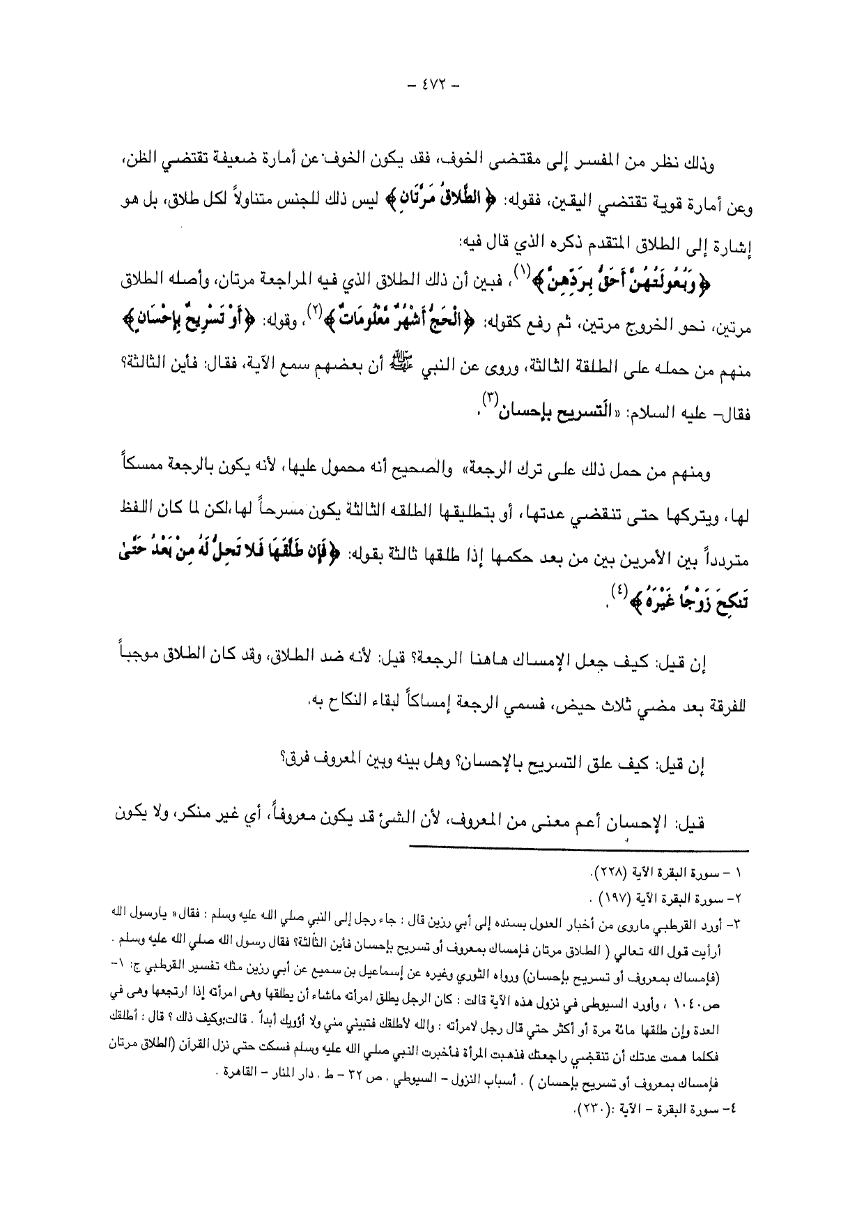 وذلك نظر من المفسر إلى مقتضى الخوف، فقد يكون الخوف عن أمارة ضعيفة تقتضي الظن، وعن أمارة قوية تقتضي اليقين، فقوله: {الطَّلَاقُ مَرَّتَانِ} ليس ذلك للجنس متناولاً لكل طلاق، بل هو إشارة إلى الطلاق المتقدم ذكره الذي قال فيه: