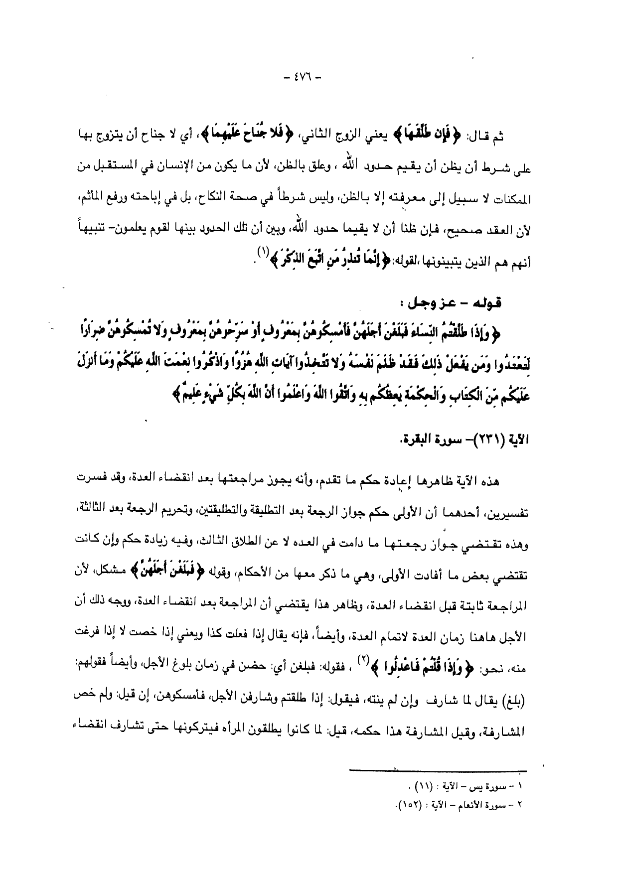 هذه الآية ظاهرها إعادة حكم ما تقدم، وأنه يجوز مراجعتها بعد انقضاء العدة، وقد فسرت تفسيرين، أحدهما أن الأولى حكم بجواز الرجعة بعد التطليقة والتطليقتين، وتحريم الرجعة بعد الثالثة، وهذه تقتضي جواز رجعتها ما دامت في العده لا عن الطلاق الثالث، وفيه زيادة حكم وإن كانت تقتضي بعض ما أفادت الأولى، وهي ذكر معها من الأحكام، وقوله: {فَبَلَغْنَ أَجَلَهُنَّ}، مشكل، لأن المراجعة ثابتة قبل انقضاء العدة، وظاهر هدا يقتضي أن المراجعة بعد انقضاء العدة، ووجه ذلك أن الأجل هاهنا زمان العدة لإتمام العدة، وأيضاً، فإنه يقال إدا فعلت كذا ويعني إذا خصت لا إذا فرغت منه، نحو: {وَإِذَا قُلْتُمْ فَاعْدِلُوا}، فقوله: فبلغن أي: حضن في زمان بلوغ الأجل، وأيضاً فقولهم: (بلغ) يقال لما شارف وإن لم ينته، فيقول: إذا طلبتم وشارفن الأجل، فأمسكوهن،