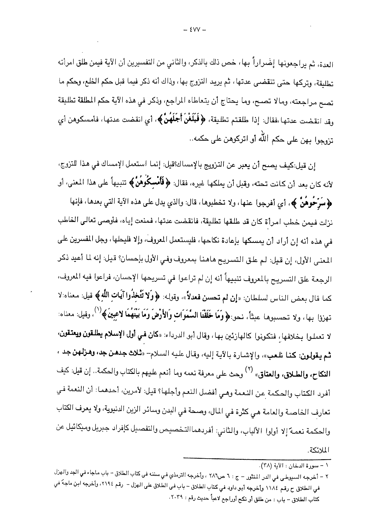 إن قيل: لم علق التسريح هاهنا بمعروف وفي الأول بإحسان؟ قيل: إنه لا أعيد ذكر الرجعة علق التسريح بالمعروف تنبيها أنه إن لم تراعوا في تسريحها الإحسان، فراعوا فيه المعروف، كما قال بعض الناس لسلطان: " إن لم تحسن فعلاً "، وقوله: {وَلَا تَتَّخِذُوا آيَاتِ اللَّهِ} قيل: معناه: لا تهزوا بها، ولا تحسبوها عبثاً، نحو: {وَمَا خَلَقْنَا السَّمَاءَ وَالْأَرْضَ وَمَا بَيْنَهُمَا لَاعِبِينَ}، وقيل: معناه: لا تعملوا بخلافها، فتكونوا كالهازئين بها، وقال أبو الدرداء: " كان في أول الإسلام يطلقون ويعتقون، ثم يقولون: كنا نلعب "، والإشارة بالآية إليه، وقال عليه السلام- " ثلاث جدهن جد، وهزلهن جد النكاح، والطلاق، والعتاق " وحث على معرفة نعمه وما أنعم عليهم بالكتاب والحكمة ..