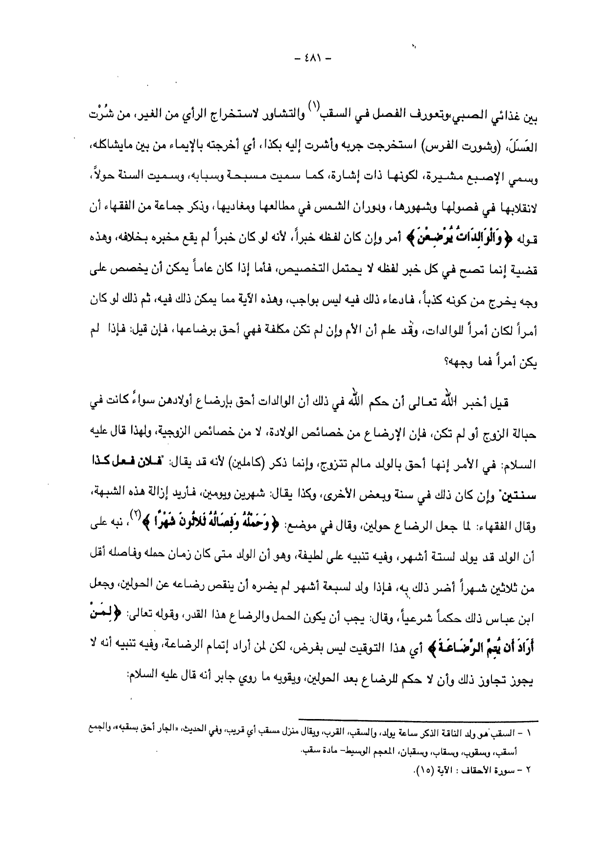 بين غذائي الصبي، وتعورف الفصل في السقب والتشاور لاستخراج الرأي من الغير، من شرت العسل، (وشورت الفرس) استخرجت جربه وأشرت إليه بكذا، أي أخرجته بالإيماء من بين ما يشاكله، وسمي الإصبع مشيرة، لكونها ذات إشارة كما سميت مسبحة وسبابه، وسميت السنة حولأ، لانقلابها في فصولها وشهورها، ودوران الشمس في مطالعها ومغاديها، وذكر جماعة من الفقهاء أن قوله: {وَالْوَالِدَاتُ يُرْضِعْنَ} أمر وإن كان لفظه خبراً، لأنه لو كان خبراً لم يقع مخبره بخلافه، وهذه قضية إنما تصح في كل خبر لفظه لا يحتمل التخصيص، فأما إذا كان عاما يمكن أن يخصص على وجه يخرج من كونه كذباً، فادعاء ذلك فيه ليس بواجب، وهذه الآية مما يمكن ذلك فيه، ثم ذلك لو كان أمرا لكان أمراً للوالدات، وقد علم أن الأم وإن لم تكن مكلفة فهي أحق برضاعها،