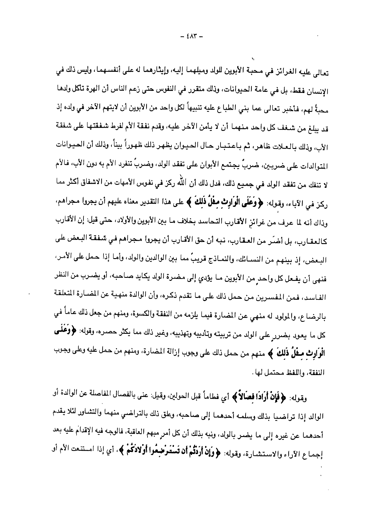 تعالى عليه الغرائز في محبة الأبوين للولد وميلهما إليه وإيثارهما له على أنفسهما، وليس ذلك في الإنسان فقط، بل في عامة الحيوانات، وذلك متقرر في النفوس حتى زعم الناس أن الهرة تأكل ولدها محبة لهم، فأخبر تعالى عما بني الطباع عليه تنبيهاً لكل واحد من الأبوين أن لا يتهم الأخر في ولده إذ قد يبلغ من شغف كل واحد منهما أن لا يأمن الأخر عليه وعدم نفقة الأم لفرط شفقتها على شفقة الأب، وذلك بالعلات ظاهر ثم باعتبار حال الحيوان يظهر ذلك ظهورا بينا وذلك أن الحيوانات المتوالدات على ضربين، ضرب يجتمع الأبوان على تفقد الولد وضرب تنفرد الأم به دون الأب، فالأم لا تنفك من تفقد الولد في جميع ذلك، فدل ذلك أن الله ركز في نفوس الأمهات من الإشفاق أكثر مما ركز في الآباء، وقوله: {وَعَلَى الْوَارِثِ مِثْلُ ذَلِكَ} على هذا التقدير معناه عليهم أن يجروا مجراهم، وذاك أنه لا عرف من غرائز الأقارب التحاسد بخلاف ما بين الأبوين والأولاد، حتى قيل: إن الأقارب كالعقارب، بل أضر من العقارب، نبه أن حق الأقارب أن يجروا مجراهم في شفقة البعض على البعض، إذ بينهم من النسائك، والنماذج قريب مما بين الوالدين والولد، وأما إذا حمل على الأمر، فنهى أن يفعل كل واحد من الأبوين ما يؤدي إلى مضرة الولد يكايد صاحبه، أو يضرب من النظر الفاسد، فمن المفسرين من حمل ذلك على ما تقدم ذكره، وأن الوالدة منهية عن المضارة المتعلقة بالرضاع، والمولود له منهي عن المضارة فيما يلزمه من النفقة والكسوة، ومنهم من جعل ذلك عاما في كل ما يعود بضرر على الولد من تربيته وتأديبه وتهذيبه وغير ذلك مما يكثر حصره، وقوله: {وَعَلَى الْوَارِثِ مِثْلُ ذَلِكَ} منهم من حمل ذلك على وجوب إزالة المضارة ومنهم من حمل عليه وعلى وجوب النفقة، واللفظ محتمل لها.