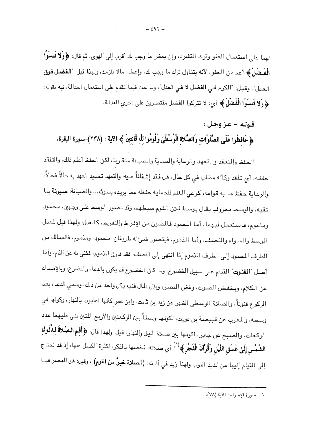 ، والصيانة: صيونة بما تقيه، والوسط معروف يقال بوسط فلان القوم سبطهم، وقد تصور الوسط على وجهين، محمود ومذموم، فاستعمل فيهما، أما المحمود فالمصون من الإفراط والتفريط، كالعدل، ولهذا قيل للعدل الوسط والسواء والنصف، وأما المذموم، فيتصور شيء له طريقان: محمود، ومذموم، فالسالك من الطرف المحمود إلى الطرف المذموم إذا انتهى إلى النصف، فقد فارق المذموم، فكنى به عن الذم، وأما أصل " القنوت " القيام على سبيل الخضوع، ولما كان الخضوع في يكون بالدعاء والتضرع، وبالإمساك عن الكلام، ويخفض الصوت، وغض البصر، وبذل المال فنبه بكل واحد من ذلك وسمي الدعاء بعد الركوع قنوتاً، والصلاة الوسطى الظهر عن زيد بن ثابت، وابن عمر كأنها اعتبرت بالنهار، وكونها في وسطه، والمغرب عن قبيصة بن دويت، لكونها وسطا بين الركعتين والأربع اللتين بنى عليهما عدد الركعات، والصبح عن جابر، لكونها بين صلاة الليل والنهار، قيل: ولهذا قال: {أَقِمِ الصَّلَاةَ لِدُلُوكِ الشَّمْسِ إِلَى غَسَقِ اللَّيْلِ وَقُرْآنَ الْفَجْرِ إِنَّ قُرْآنَ الْفَجْرِ} أي صلاته، فخصها بالذكر، لكثرة الكسل عنها، إذ قد تحتاج إلى القيام إليها من لذيذ النوم، ولهذا زيد في أذانه: (الصلاة خير من النوم)، وقيل: هو العصر فيما