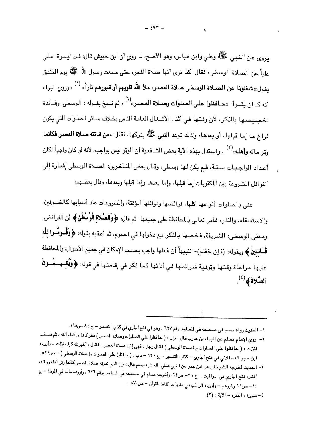 يقول: " شغلونا عن الصلاة الوسطى صلاة العصر، ملأ الله قلوبهم أو قبورهم ناراً "، وروي البراء أنه كان يقرأ: " حافظوا على الصلوات وصلاة العصر "، ثم نسخ بقوله: الوسطى، وفائدة تخصيصها بالذكر، لأن وقتها في أثناء الأشغال العامة الناس بخلاف سائر الصلوات التي يكون فراغ ما إما قبلها، أو بعدها، ولذلك توعد النبي - صلى الله عليه وسلم - بتركها، فقال: " من فاتته صلاة العصر فكأنما وتر ماله وأهله "، واستدل بهذه الآية بعض الشافعية أن الوتر ليس بواجب، لأنه لو كان واجباً لكان أعداد الواجبات ستة، فلم يكن لها وسطى، وقال بعض المتأخرين: الصلاة الوسطى إشارة إلى النوافل المشروعة بين المكتوبات إما قبلها، وإما بعدها وإما قبلها وبعدها، وقال بعضهم: