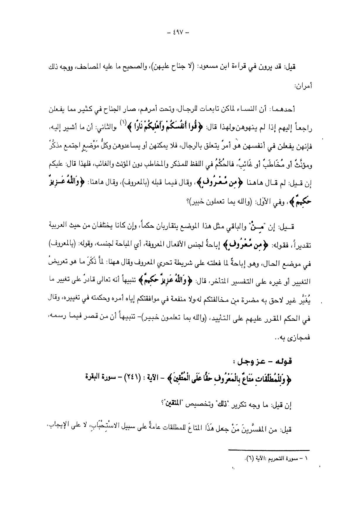 أحدهما: أن النساء لما كن تابعات للرجال، وتحرر أمرهم، صار الجناح في كثير مما يفعلن راجعاً إليهم إذا لم ينهوهن، ولهذا قال: {قُوا أَنْفُسَكُمْ وَأَهْلِيكُمْ نَارًا} والتاني: أن ما يشير إليه، فإنهن يفعلن في أنفسهن هو أمر يتعلق بالرجال، فلا يمكنهن أو يساعدوهن وكل موضع اجتمع مذكر ومؤنث أو مخاطب أو غائب، فالحكم في اللفظ للمذكر والمخاطب دون المؤنث والغائب، فلهذا قال: عليكم إن قليل: لم قال هاهنا {مِنْ مَعْرُوفٍ}، وقال فيما قبله (بالمعروف)، وقال هاهنا: {وَاللَّهُ عَزِيزٌ حَكِيمٌ}، وفي الأول: (والله بما تعملون خبير)؟