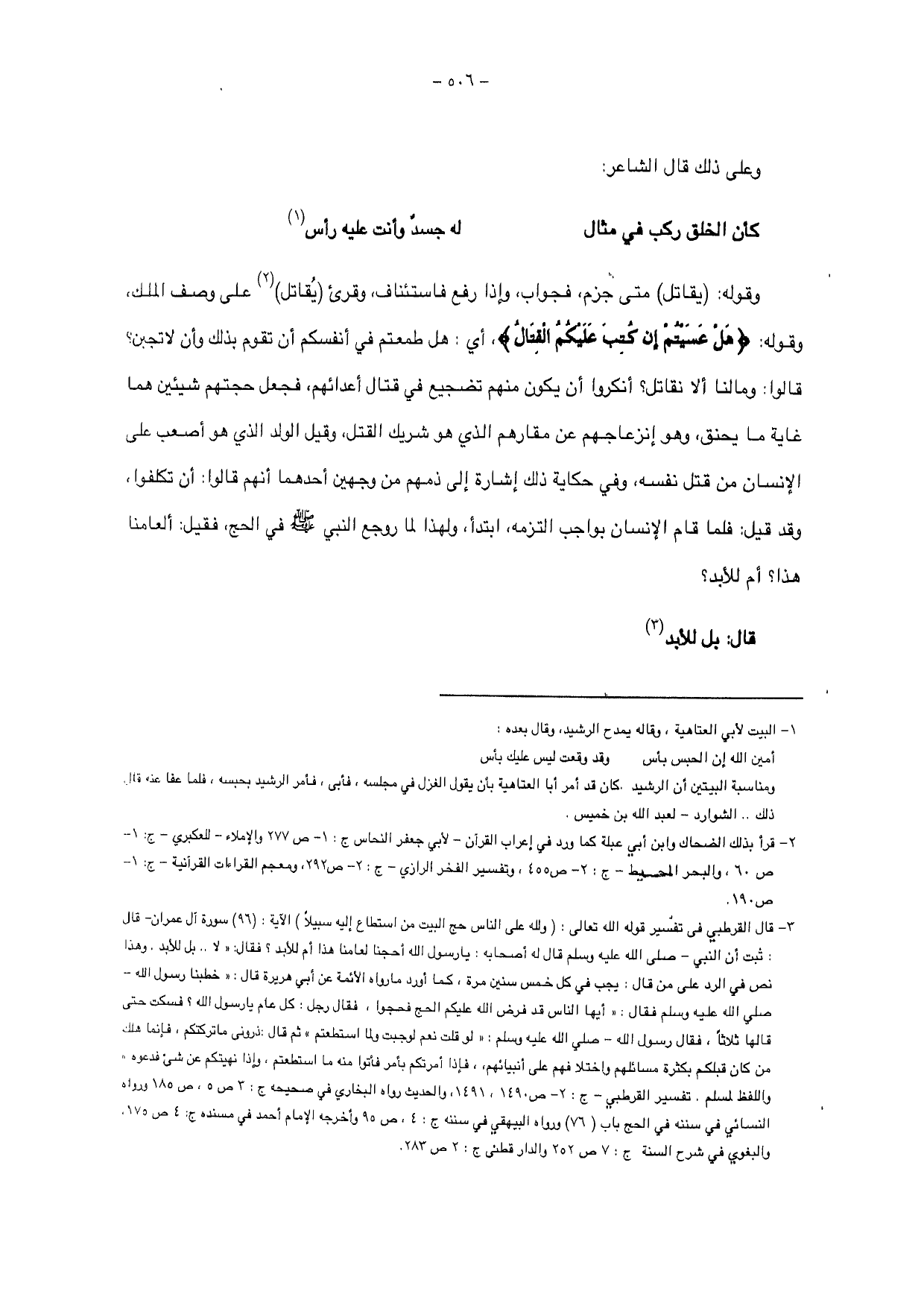 وقوله: (يقاتل) متى جزم، فجواب، وإذا رفع فاستئناف، وقرئ (يقاتل) على وصف الملك، وقوله: {هَلْ عَسَيْتُمْ إِنْ كُتِبَ عَلَيْكُمُ الْقِتَالُ} أي: هل طمعتم في أنفسكم أن تقوم بذلك وأن لا تجن؟ قالوا: وما لنا ألا نقاتل؟ أنكروا أن يكون منهم تضجيع في قتال أعدائهم، فجعل حجتهم شيئين هما غاية ما يحنق، وهو انزعاجهم عن مقارهم الذي هو شريك القتل، وقيل الولد الذي هو أصعب على الإنسان من قتل نفسه، وفي حكاية ذلك إشارة إلى ذمهم من وجهين أحدهما أنهم قالوا: أن تكلفوا، وقد قيل: فلما قام الإنسان بواجب التزامه، ابتدأ ولهذا لما روجع النبي - صلى الله عليه وسلم - في الحج، فقيل: ألعامنا هذا؟ أم للأبد؟