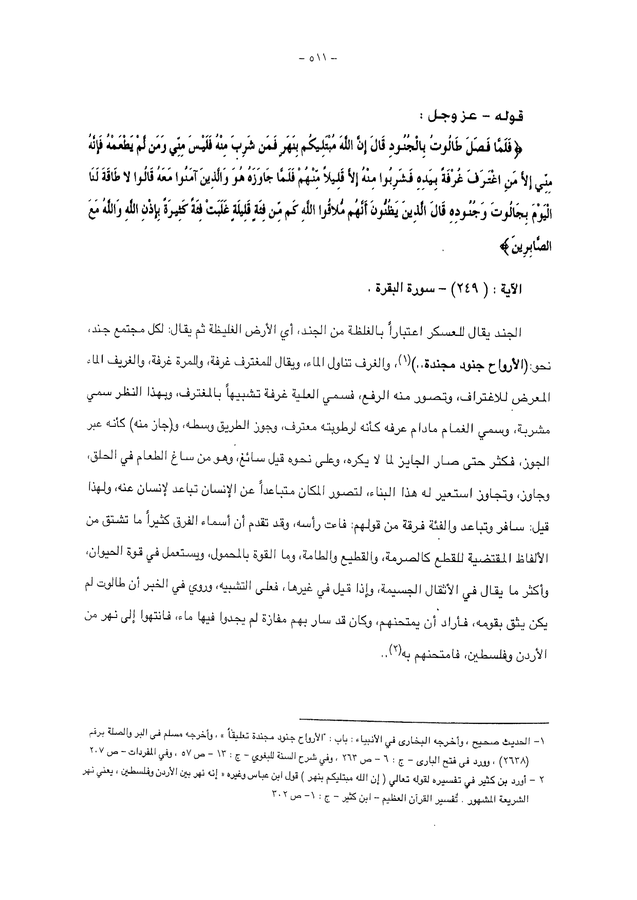 الجند يقال للعسكر اعتباراً بالغلظة من الجند، أي الأرض الغليظة ثم يقال: لكل مجتمع جند، نحو: (الأرواح جنود مجندة .. )، والغرف تناول الماء، ويقال للمعترف غرفة، وللمرة غرفة، والغريف الماء المعرض للاغتراف، وتصور منه الرفع، فسمي العلية غرفة تشبيهاً بالمغترف، وبهذا النظر سمي مشربة، وسمي الغمام مادام عرفه كأنه لرطوبته معترف، وجوز الطريق وسطه، و (جاز منه) كأنه عبر الجوز، فكثر حتى صار الجايز لما لا يكره، وعلى نحوه قيل سائغ، وهو من ساغ الطعام في الحلق، وجاوز، وتجاوز استعير له هذا البناء، لتصور المكان متباعداً عن الإنسان تباعد لإنسان عنه، ولهذا قيل: سافر وتباعد والفئة فرقة من قولهم: فاءت رأسه، وقد تقدم أن أسماء الفرق كثيراً ما تشتق من الألفاظ المقتضية للقطع كالصرمة، والقطيع والطامة، وما القوة بالمحمول، ويستعمل في قوة الحيوان، وأكثر ما يقال في الأثقال الجسيمة، وإذا قيل في غيرها، فعلى التشبيه، وروي في الخبر أن طالوت لم يكن يثق بقومه، فأراد أن يمتحنهم، وكان قد سار بهم مفازة لم يجدوا فيها ماء، فانتهوا إلى نهر من الأردن وفلسطين، فامتحنهم به ..