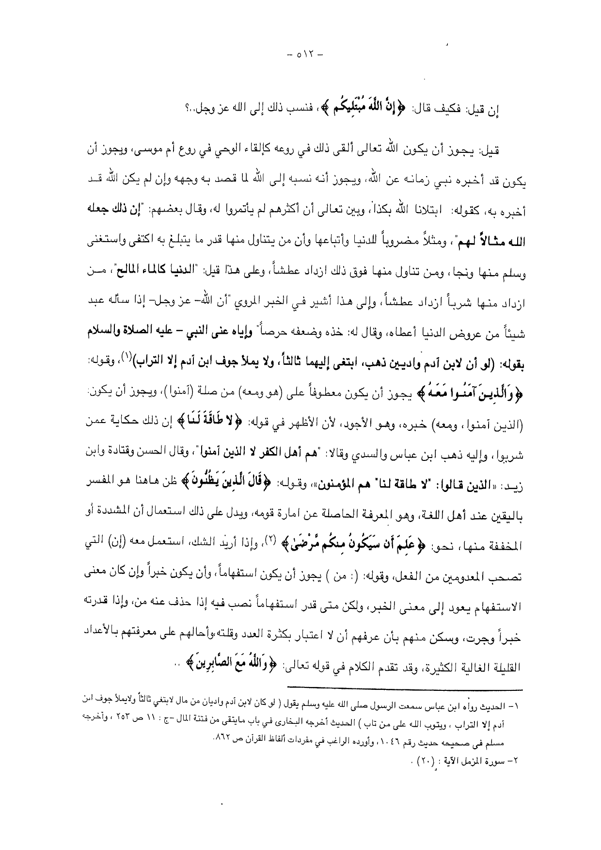 قيل: يجوز أن يكون الله تعالى ألقى ذلك في روعه كإلقاء الوحي في روع أم موسى، ويجوز أن يكون قد أخبره نبي زمانه عن الله، ويجوز أنه نسبه إلى الله لما قصد به وجهه وإن لم يكن الله قد أخبره به، كقوله: ابتلانا الله بكذا، وبين تعالى أن أكثرهم لم يأتمروا له، وقال بعضهم: " إن ذلك جعله الله مثالاً لهم "، ومثلاً مضروباً للدنيا وأتباعها وأن من يتناول منها قدر ما يتبلغ به اكتفى واستغنى وسلم منها ونجا، ومن تناول منها فوق ذلك ازداد عطشاً، وعلى هذا قيل: " الدنيا كالماء المالح "، من ازداد منها شرباً ازداد عطشاً، وإلى هذا أشير في الخبر المروي " أن الله - عز وجل - إذا سأله عبد شيئاً من عروض الدنيا أعطاه، وقال له: خذه وضعفه حرصاً " وإياه عني النبي - عليه الصلاة والسلام بقوله: (لو أن لابن آدم واديين ذهب، ابتغى إليهما ثالثاً، ولا يملأ جوف ابن آدم إلا التراب)، وقوله: {وَالَّذِينَ آمَنُوا مَعَهُ} يجوز أن يكون معطوفاً على (هو ومعه) من صلة (آمنوا)، ويجوز أن يكون: (الذين آمنوا، ومعه) خبره، وهو الأجود، لأن الأظهر في قوله: {لَا طَاقَةَ لَنَا} إن ذلك حكاية عمن شربوا، وإليه ذهب ابن عباس والسدي وقالا: " هم أهل الكفر لا الذين آمنوا "، وقال الحسن وقتادة وابن زيد: " الذين قالوا: " لا طاقة لنا " هم المؤمنون " وقوله: {قَالَ الَّذِينَ يَظُنُّونَ} ظن ها هنا هو المفسر باليقين عند أهل اللغة، وهو المعرفة الحاصلة عن امارة قومه، ويدل على ذلك استعمال أن المشددة أو المخففة منها، نحو: {عَلِمَ أَنْ سَيَكُونُ مِنْكُمْ مَرْضَى} وإذا أريد الشك، استعمل معه (إن) التي تصحب المعدومين من الفعل، وقوله: (من) يجوز أن يكون استفهاماً، وأن يكون خبراً وإن كان معنى الاستفهام يعود إلى معنى الخبر، ولكن متى قدر استفهاماً نصب فيه إذا حذف عنه من، وإذا قدرته خبراً وجرت، وسكن منهم بأن عرفهم أن لا اعتبار بكثرة العدد وقلته وأحالهم على معرفتهم بالأعداد القليلة الغالية الكثيرة، وقد تقدم الكلام في قوله تعالى: {وَاللَّهُ مَعَ الصَّابِرِينَ} ..
