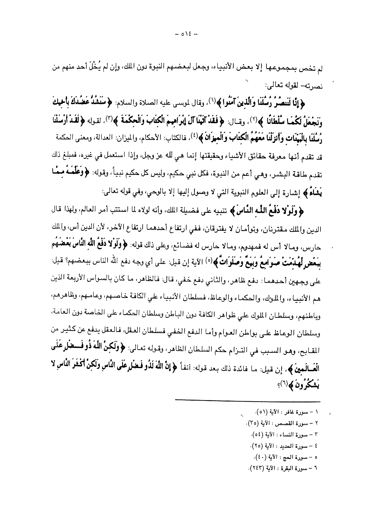 {إِنَّا لَنَنْصُرُ رُسُلَنَا وَالَّذِينَ آمَنُوا} وقال لموسى عليه الصلاة والسلام: {سَنَشُدُّ عَضُدَكَ بِأَخِيكَ وَنَجْعَلُ لَكُمَا سُلْطَانًا} وقال: {فَقَدْ آتَيْنَا آلَ إِبْرَاهِيمَ الْكِتَابَ وَالْحِكْمَةَ} لقوله {لَقَدْ أَرْسَلْنَا رُسُلَنَا بِالْبَيِّنَاتِ وَأَنْزَلْنَا مَعَهُمُ الْكِتَابَ وَالْمِيزَانَ} فالكتاب: الأحكام، والميزان: العدالة، ومعنى الحكمة قد تقدم أنها معرفة حقائق الأشياء وحقيقتها إنما هي لله عز وجل، وإذا استعمل في غيره، فمبلغ ذلك تقدم طاقة البشر، وهي أعم من النبوة، فكل نبي حكيم، وليس كل حكيم نبياً، وقوله: {وَعَلَّمَهُ مِمَّا يَشَاءُ} إشارة إلى العلوم النبوية التي لا وصول إليها إلى بالوحي، وفي قوله تعالى: