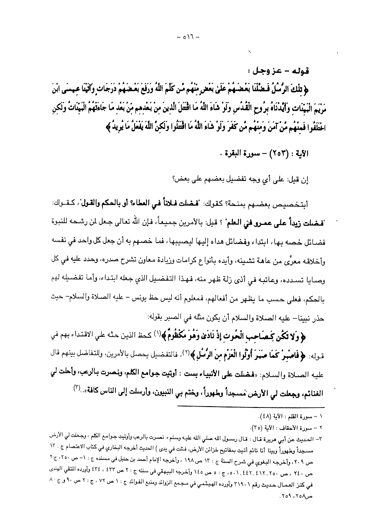 أبتخصيص بعضهم بمنحة؟ كقولك: " فضلت فلاناً في العطاء؟ أو بالحكم والقول "، كقولك: " فضلت زيداً على عمرو في العلم "؟ قيل: بالأمرين جميعاً، فإن الله تعالى جعل لمن رشحه للنبوة فضائل خصه بها، ابتداء وفضائل هداه إليها ليصيبها، فما خصهم به أن جعل كل واحد في نفسه وأخلاقه معرى من عاهة تشينه، وأيده بأنواع كرامات وزيادة معاون تشرح صدره، وحدد عليه في كل وصايا تسدده، وعاتبه في أذى زلة ظهر منه، فهذا التفضيل الذي جعله ابتداء، وأما تفضيله لهم بالحكم، فعلى حسب ما يظهر من أفعالهم، فمعلوم أنه ليس حظ يونس - عليه الصلاة والسلام - حيث حذر نبينا - عليه الصلاة والسلام أن يكون مثله في الصبر بقوله: