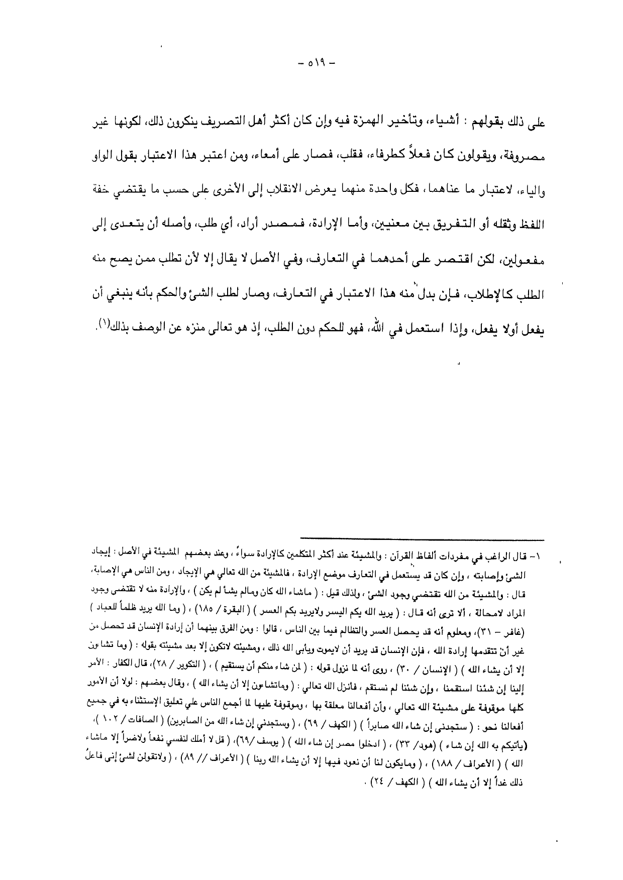 على ذلك بقولهم: أشياء، وتأخير الهمزة فيه وإن كان أكثر أهل التصريف ينكرون ذلك، لكونها غير مصروفة، ويقولون كان فعلاً كطرفاء، فقلب، فصار على أمعاء، ومن اعتبر هذا الاعتبار بقول الواو والياء، لاعتبار ما عناهما، فكل واحدة منهما يعرض الانقلاب إلى الأخرى على حسب ما يقتضي خفة اللفظ وثقله أو التفريق بين معنيين، وأما الإرادة، فمصدر أراد، أي طلب، وأصله أن يتعدى إلى مفعولين، لكن اقتصر على أحدهما في التعارف، وفي الأصل لا يقال إلا لأن تطلب ممن يصح منه الطلب كالإطلاب، فإن بدل منه هذا الاعتبار في التعارف، وصار لطلب الشيء والحكم بأنه ينبغي أن يفعل أولا يفعل، وإذا استعمل في الله، فهو للحكم دون الطلب، إذ هو تعالى منزه عن الوصف بذلك.