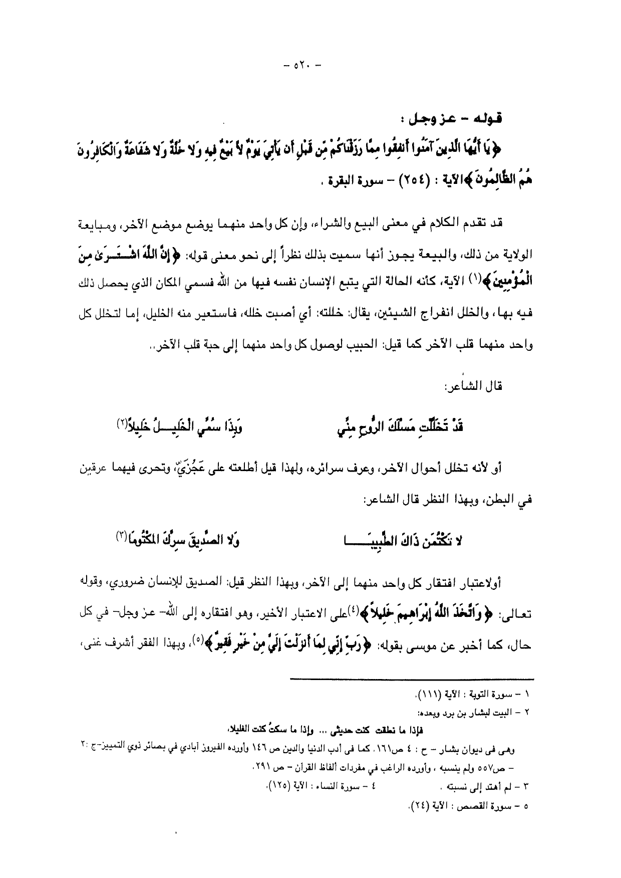 قد تقدم الكلام في معنى البيع والشراء، وإن كل واحد منهما يوضع موضع الآخر، ومبايعة الولاية من ذلك، والبيعة يجوز أنها سميت بذلك نظراً إلى نحو معنى قوله: {إِنَّ اللَّهَ اشْتَرَى مِنَ الْمُؤْمِنِينَ} الآية، كأنه الحالة التي يتبع الإنسان نفسه فيها من الله فسمي المكان الذي يحصل ذلك فيه بها، والخلل انفراج الشيئين، يقال: خللته: أي أصبت خلله، فاستعير منه الخليل، إما لتخلل كل واحد منهما قلب الآخر كما قيل: الحبيب لوصول كل واحد منهما إلى حبة قلب الآخر ..