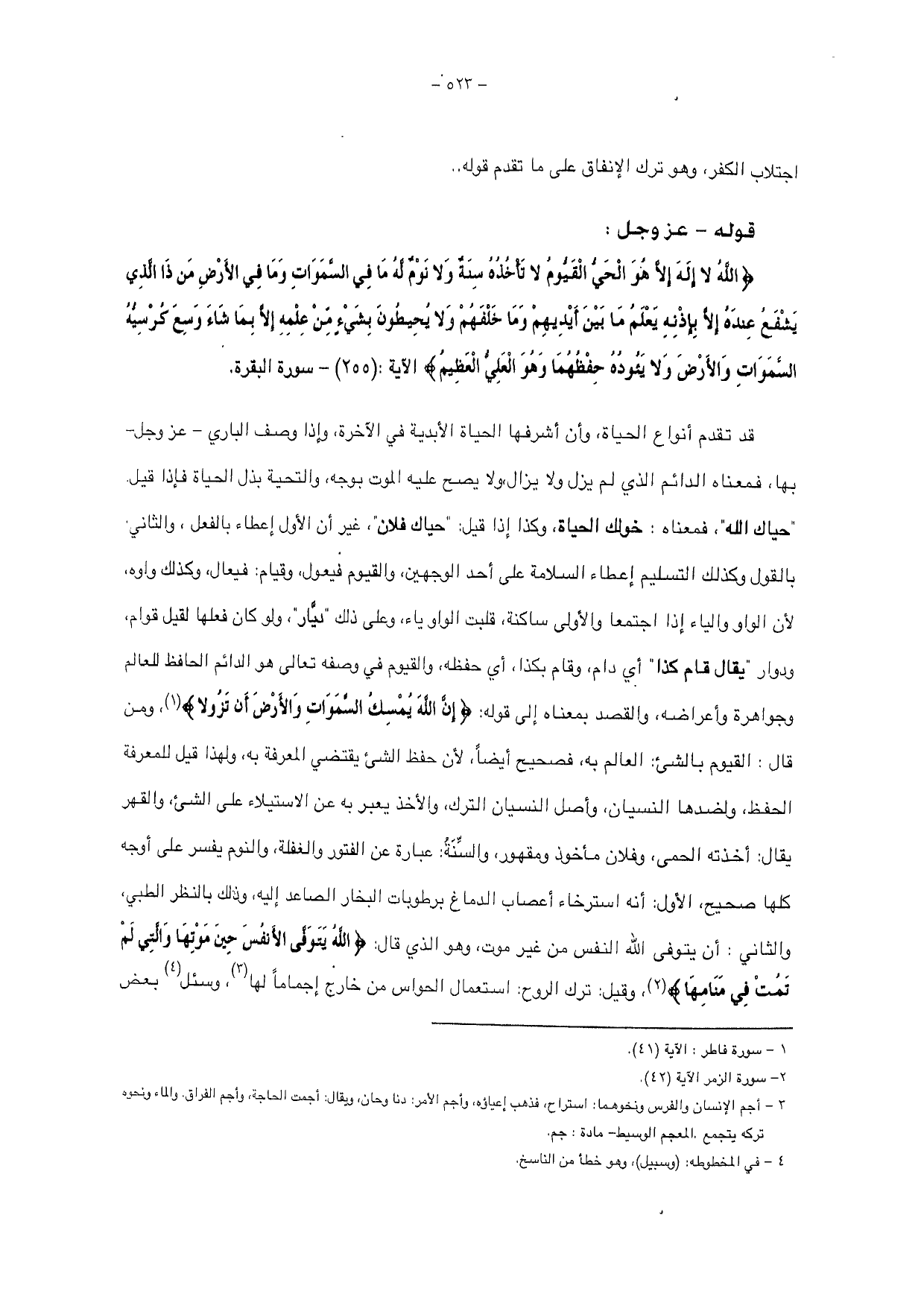 " حياك الله "، فمعناه: خولك الحياة، وكذا إذا قيل: " حياك فلان " غير أن الأول إعطاء بالفعل، والثاني بالقول وكذلك التسليم إعطاء السلامة على أحد الوجهين، والقيوم فيعول، وقال: فيعال، وكذلك واوه لأن الواو والياء إذا اجتمعا والأولى ساكنة، قبلت الواو ياء، وعلى ذلك " ديار " ولو كان فعلها لقيل قوام، ودوار " يقال قام كذا " أي دام، وقام بكذا، أي حفظه، والقيوم في وصفه تعالى هو الدائم الحافظ للعالم وجواهره وأعراضه، والقصد بمعناه إلى قوله: {إِنَّ اللَّهَ يُمْسِكُ السَّمَاوَاتِ وَالْأَرْضَ أَنْ تَزُولَا} ومن قال: القيوم بالشيء: العالم به، فصحيح أيضا، لأن حفظ الشيء يقتضي المعرفة به، ولهذا قيل للمعرفة الحفظ، ولضدها النسيان، وأصل النسيان الترك، والأخذ يعبر به عن الاستيلاء على الشيء والقهر يقال: أخذته الحمى، وفلان مأخوذ ومقهور، والسنة: عبارة عن الفتور والغفلة، والنوم يفسر على أوجه كلها صحيح، الأول: أنه استرخاء أعصاب الدماغ برطوبة البخار الصاعد إليه، وذلك بالنظر الطبي، والثاني: أن يتوفى الله النفس من غير موت، وهو الذي قال: {اللَّهُ يَتَوَفَّى الْأَنْفُسَ حِينَ مَوْتِهَا وَالَّتِي لَمْ تَمُتْ فِي مَنَامِهَا} وقيل: ترك الروح: استعمال الحواس من خارج إجماماً لها، وسئل بعض