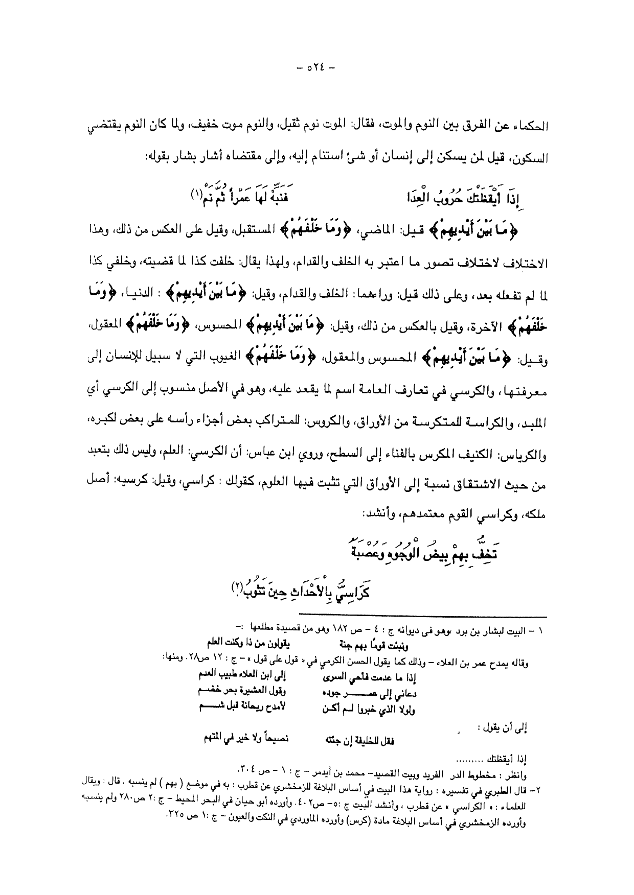 {مَا بَيْنَ أَيْدِيهِمْ} قيل: الماضي، {وَمَا خَلْفَهُمْ} المستقبل، وقيل على العكس من ذلك، وهذا الاختلاف لاختلاف تصور ما اعتبر به الخلف والقدام، ولهذا يقال: خلفت كذا لما قضيته، وخلفي كذا لما لم تفعله بعد، وعلى ذلك قيل: وراءهما: الخلف والقدام، وقيل: {ما بين أيديهم}: الدنيا، {وَمَا خَلْفَهُمْ} الآخرة، وقيل بالعكس من ذلك، وقيل: {مَا بَيْنَ أَيْدِيهِمْ}: المحسوس، {وَمَا خَلْفَهُمْ} المعقول، وقيل: {مَا بَيْنَ أَيْدِيهِمْ} المحسوس والمعقول، {وَمَا خَلْفَهُمْ} الغيوب التي لا سبيل للإنسان إلى معرفتها، والكرسي في تعارف العامة اسم لما يقعد عليه، وهو في الأصل منسوب إلى الكرسي أي الملبد، والكراسة للمتكرسة من الأوراق، والكروس، للمتراكب بعض أجزاء رأسه على بعض لكبره، والكرياس: الكنيف المكرس بالفناء إلى السطح، وروي ابن عباس: أن الكرسي: العلم، وليس ذلك بتعبد من حيث الاشتقاق نسبة إلى الأوراق التي تثبت فيها العلوم، كقولك: كراسي، وقيل: كرسيه: أصل ملكه، وكراسي القوم معتمدهم، وأنشد: