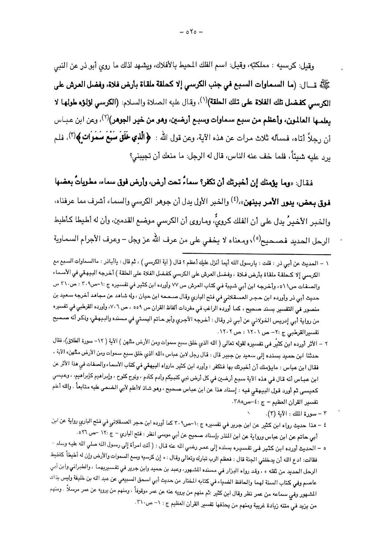 فقال: " وما يؤمنك إن أخبرتك أن تكفر؟ سماء تحت أرض، وأرض فوق سماء، مطويات بعضها فوق بعض، يدور الأمر بينهن "، والخبر الأول يدل أن جوهر الكرسي والسماء أشرف مما عرفناه، والخبر الأخير يدل على أن الفلك كروي، وما روى أن الكرسي موضع القدمين، وأن له أطيطا كأطيط الرحل الحديد فصحيح، ومعناه لا يخفي على من عرف الله عز وجل - وعرف الأجرام السماوية