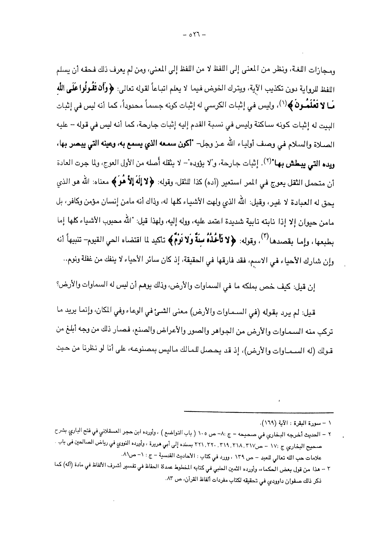 ومجازات اللغة، ونظر من المعنى إلى اللفظ لا من اللفظ إلى المعنى، ومن لم يعرف ذلك فحقه أن يسلم اللفظ للرواية دون تكذيب الآية، ويترك الخوض فيما لا يعلم إتباعاً لقوله تعالى: {وَأَنْ تَقُولُوا عَلَى اللَّهِ مَا لَا تَعْلَمُونَ} وليس في إثبات الكرسي له إثبات كونه جسماً محدوداً، كما أنه ليس في إثبات البيت له إثبات كونه ساكنة وليس في نسبة القدم إليه إثبات جارحة، كما أنه ليس في قوله - عليه الصلاة والسلام في وصف أولياء الله عز وجر - " أكون سمعه الذي يسمع به، وعينه التي يبصر بها، ويده التي يبطش بها " إثبات جارحة، و " لا يؤوده " - لا يثقله أصله من الأول العوج، ولما جرت العادة أن متحمل الثقل يعوج في الممر استعير (أده) كذا للثقل، وقوله: {لَا إِلَهَ إِلَّا هُوَ} معناه: الله هو الذي يحق له العبادة لا غير، وقيل: الله الذي ولهت الأشياء كلها له، وذاك أنه ما من إنسان مؤمن وكافر، بل ما من حيوان إلا إذا نابته نابية شديدة اعتمد عليه، ووله إليه، ولهذا قيل: " الله محبوب الأشياء كلها إما بطبعها، وإما بقصدها، وقوله: {لَا تَأْخُذُهُ سِنَةٌ وَلَا نَوْمٌ} تأكيد لما اقتضاه الحي القيوم - تنبيهاً أنه وإن شارك الأحياء في الاسم، فقد فارقها في الحقيقة، إذ كان سائر الأحياء لا ينفك من غفلة ونوم ..