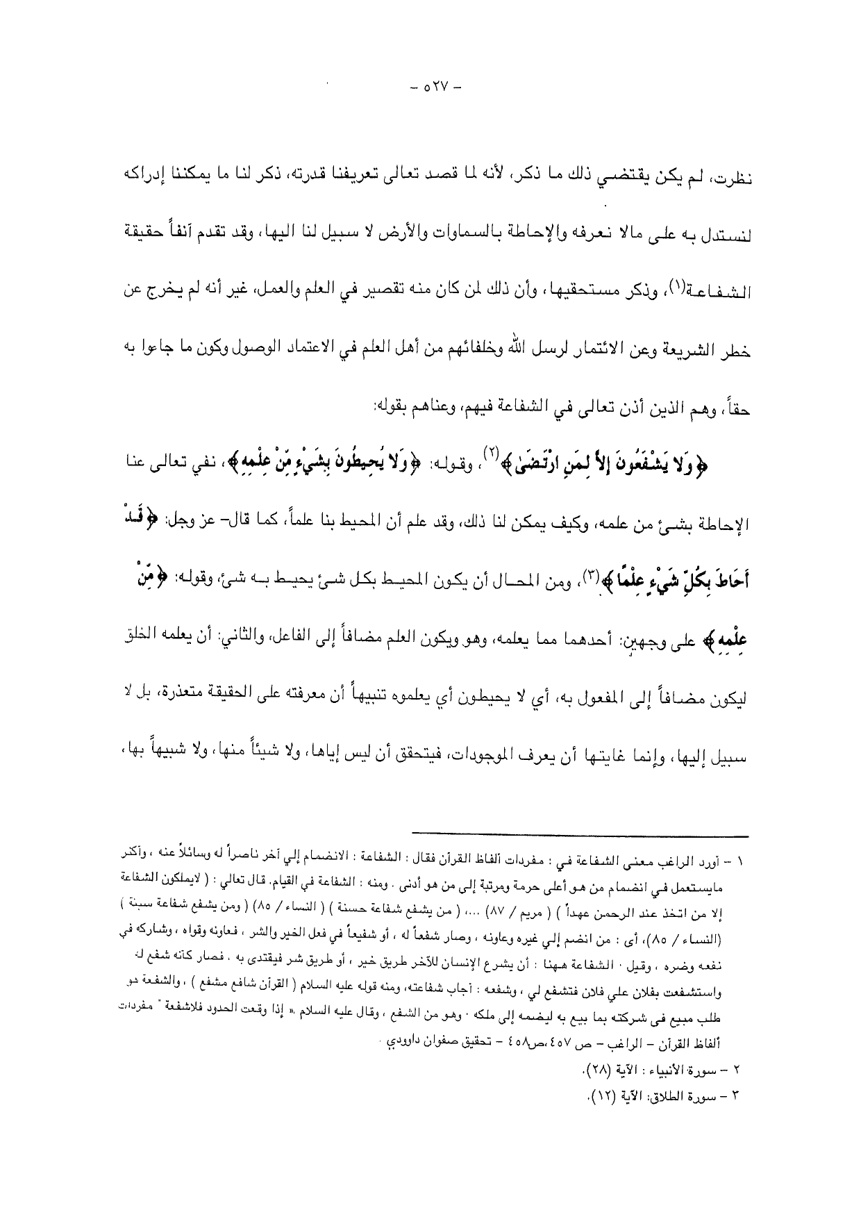 نظرت، لم يكن يقتضي ذلك ما ذكر، لأنه لما قصد تعالى تعريفنا قدرته، ذكر لنا ما يمكننا إدراكه لنستدل به على ما لا نعرفه والإحاطة بالسماوات والأرض لا سبيل لنا إليها، وقد تقدم آنفاً حقيقة الشفاعة، وذكر مستحقيها، وأن ذلك لمن كان منه تقصير في العلم والعمل، غير أنه لم يخرج عن خطر الشريعة وعن الائتمار لرسل الله وخلفائهم من أهل العلم في الاعتماد الوصول وكون ما جاءوا به حقاً، وهم الذين أذن تعالى في الشفاعة فيهم، وعناهم بقوله: