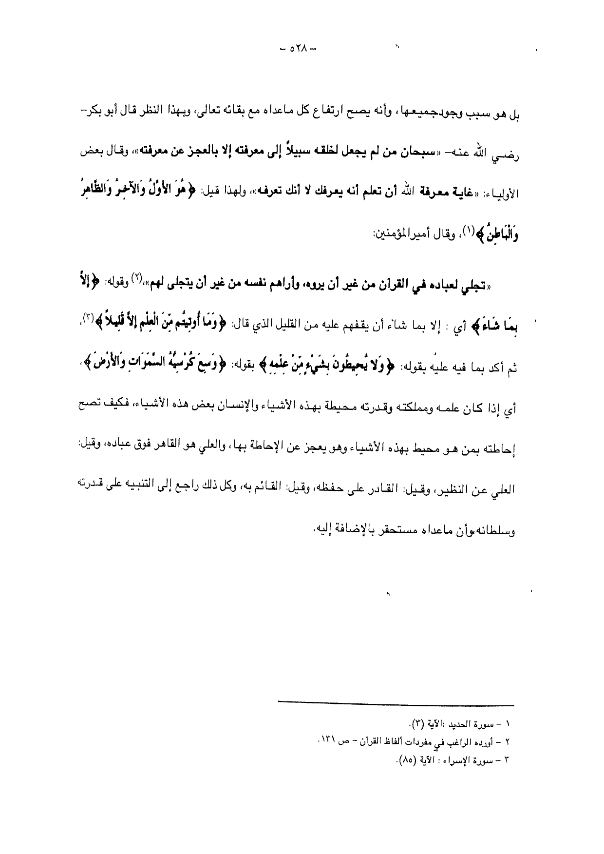 بل هو سبب وجود جميعها، وأنه يصح ارتفاع كل ما عداه مع بقائه تعالى، وبهذا النظر قال أبو بكر - رضي الله عنه - " سبحان من لم يجعل لخلقه سبيلاً إلى معرفته إلا بالعجز عن معرفته "، وقال بعض الأولياء: " غاية معرفة الله أن تعلم أنه يعرفك لا أنك تعرفه "، ولهذا قيل: {هُوَ الْأَوَّلُ وَالْآخِرُ وَالظَّاهِرُ وَالْبَاطِنُ} وقال أمير المؤمنين: