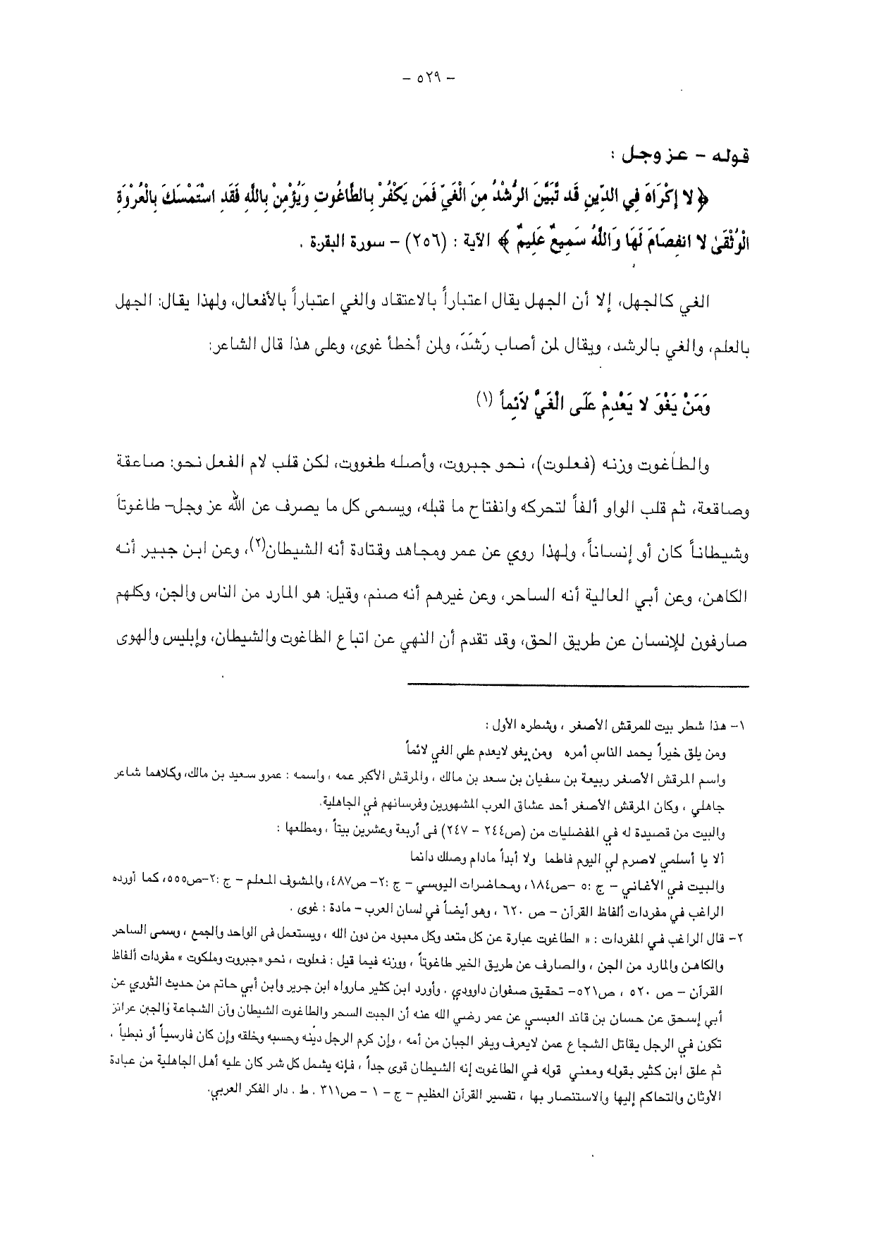 والطاغوت وزنه (فعلوت)، نحو جبروت وأصله طغووت، لكن قلب لام الفعل نحو: صاعقة وصاعقة، ثم قلب الواو ألفاً لتحركه وانفتاح ما قبله، ويسمى كل ما يصرف عن الله عز وجل - طاغوتاً وشيطاناً كان أو إنساناً، ولهذا روي عن عمر ومجاهد وقتادة أنه الشيطان، وعن ابن جبير أنه الكاهن، وعن أبي العالية أنه الساحر، وعن غيرهم أنه صنم، وقيل: هو المارد من الناس والجن، وكلهم صارفون للإنسان عن طريق الحق، وقد تقدم أن النهي عن أتباع الطاغوت والشيطان، وإبليس والهوى