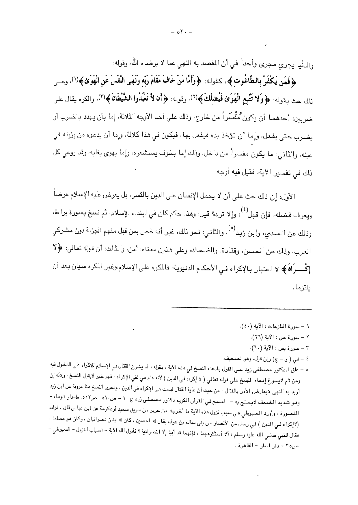{فَمَنْ يَكْفُرْ بِالطَّاغُوتِ}، كقوله: {وَأَمَّا مَنْ خَافَ مَقَامَ رَبِّهِ وَنَهَى النَّفْسَ عَنِ الْهَوَى} وعلى ذلك حث بقوله: {وَلَا تَتَّبِعِ الْهَوَى فَيُضِلَّكَ} وقوله: {أَنْ لَا تَعْبُدُوا الشَّيْطَانَ} والكره يقال على ضربين: أحدهما أن يكون مفسراً من خارج، وذلك على أحد الأوجه الثلاثة، إما بأن يهدد بالضرب أو يضرب حتى يفعل، وإما أن تؤخذ يده فيفعل بها، فيكون في هذا كلالة، وإما أن يدعوه من يزينه في عينه، والثاني: ما يكون مفسراً من داخل، وذلك إما بخوف يستشعره، وإما بهوى يغلبه، وقد روعي كل ذلك في تفسير الآية، فقيل فيه أوجه:
