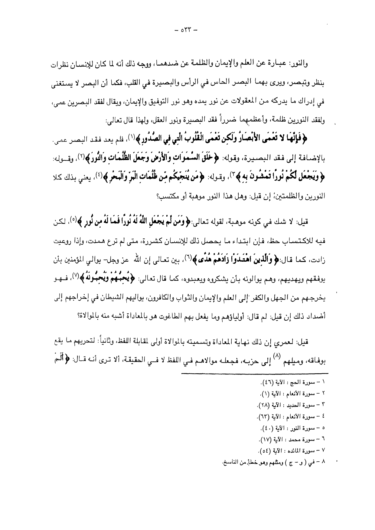 والنور: عبارة عن العلم والإيمان والظلمة عن ضدهما، ووجه ذلك أنه لما كان للإنسان نظرات بنظر وتبصر، ويرى بهما البصر الحاس في الرأس والبصيرة في القلب، فكما أن البصر لا يستغنى في إدراك ما يدركه من المعقولات عن نور يمده وهو نور التوفيق والإيمان، ويقال لفقد البصرين عمى، ولفقد النورين ظلمة، وأعظمهما ضرراً فقد البصيرة ونور العقل، ولهذا قال تعالى: