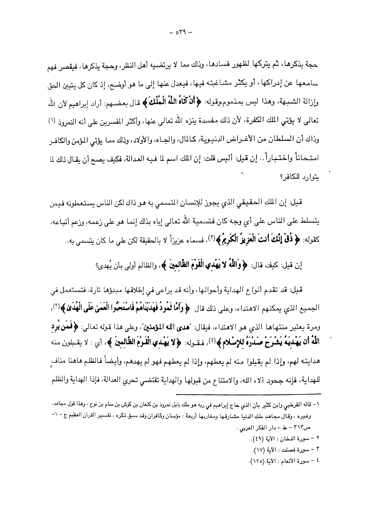 حجة يذكرها، ثم يتركها لظهور فسادها، وذلك مما لا يرتضيه أهل النظر وحجة يذكرها، فيقصر فهم سامعها عن إدراكها، أو يكثر مشاغبته فيها، فيعدل عنها إلي ما هو أوضح، إذ كان كل يتبين الحق وإزالة الشبهة، وهذا ليس بمذموم، وقوله: {أَنْ آتَاهُ اللَّهُ الْمُلْكَ} قال بعضهم: أراد إبراهيم لأن الله تعالى لا يؤتي الملك الكفرة، لأن ذلك مفسدة ينزه الله تعالى عنها، وأكثر المفسرين على أنه النمروذ وذاك أن السلطان من الأغراض الدنيوية، كالمال، والجاه، والأولاد، وذلك مما يؤتي المؤمن والكافر امتحانا واختباراً ...