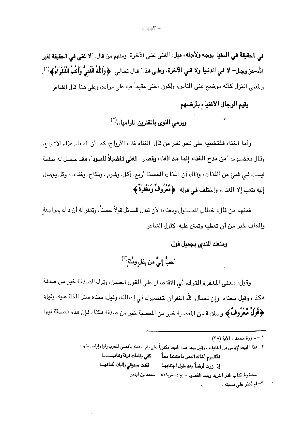 في الحقيقة في الدنيا يوجه ولأجله " قيل: الغنى غنى الآخرة ومنهم من قال: " لا غنى في الحقيقة لغير الله -عز وجل - لا في الدنيا ولا في الآخرة وعلى هذا " قال تعالى: {وَاللَّهُ الْغَنِيُّ وَأَنْتُمُ الْفُقَرَاءُ} والمعنى المنزل كأنه موضع غنى الناس، ولكون الغنى مقيما فيه على مراده وعلى هذا قال الشاعر:
