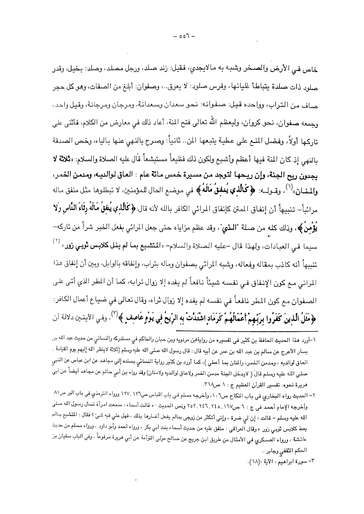 ثانيا: وصرح بالنهي عنها بالياء، وخص الصدقة بالنهي إذ كان المنة فيها أعظم وأشبع ولكون ذلك فظيعا مستبشعا قال عليه الصلاة والسلام: " ثلاثة لا يجدون ريح الجنة، وإن ريحها لتوجد من مسيرة خمس مائة عام: العاق لوالديه ومدمن الخمر والمنان "، وقوله: {كَالَّذِي يُنْفِقُ مَالَهُ} في موضع الحال للمؤمنين، لا تبطلوها مثل منفق ماله مرائيا - تنبيها أن إنفاق الممتن كإنفاق المرائي الكافر بالله لأنه قال: {كَالَّذِي يُنْفِقُ مَالَهُ رِئَاءَ النَّاسِ وَلَا يُؤْمِنُ}، وذلك كله من صلة " الذي " وقد عظم مزاياه حتى جعل المرائي بفعل الخير شرا من تاركه - سيما في العبادات، ولهذا قال - عليه الصلاة والسلام - " المتشبع بما لم ينل كلابس ثوبي زور " تنبيها أنه كاذب بمقاله وفعاله، وشبه المرائي بصفوان وماله بتراب، وإنفاقه بالوابل وبين أن إنفاق هذا المرائي مع كون الإنفاق في نفسه شيئا نافعاً لم يفده إلا زوال ترابه، كما أن المطر الذي أتى على الصفوان مع كون المطر نافعا في نفسه لم يفده إلا زوال ثراه وقال تعالى في ضياع أعمال الكافر: {مَثَلُ الَّذِينَ كَفَرُوا بِرَبِّهِمْ أَعْمَالُهُمْ كَرَمَادٍ اشْتَدَّتْ بِهِ الرِّيحُ فِي يَوْمٍ عَاصِفٍ}، وفي الآيتين دلالة أن