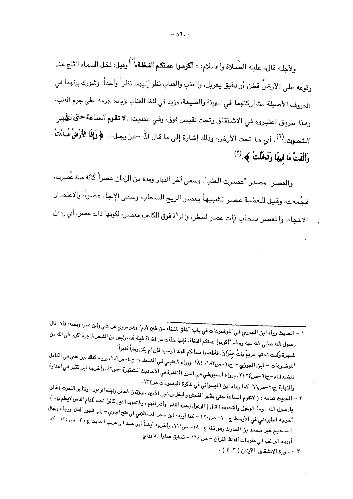 ولأجله قال، عليه الصلاة والسلام: " أكرموا عمتكم النخلة " وقيل: نخل السماء الثلج عند وقوعه على الأرض قطن أو دقيق يغربل، والعنب والعناب نظر إليهما نظرا واحدا، وشورك بينهما في الحروف الأصيلة مشاركتهما في الهيئة والصيغة وزيد في لفظ العناب لزيادة جرمه على جرم العنب، وهذا طريق اعتبروه في الاشتقاق وتحت نقيض فوق وفي الحديث: " لا تقوم الساعة حتى تظهر التحوت "، أي ما تحت الأرض، وذلك إشارة إلى قال الله - عز وجل - {وَإِذَا الْأَرْضُ مُدَّتْ (3) وَأَلْقَتْ مَا فِيهَا وَتَخَلَّتْ}