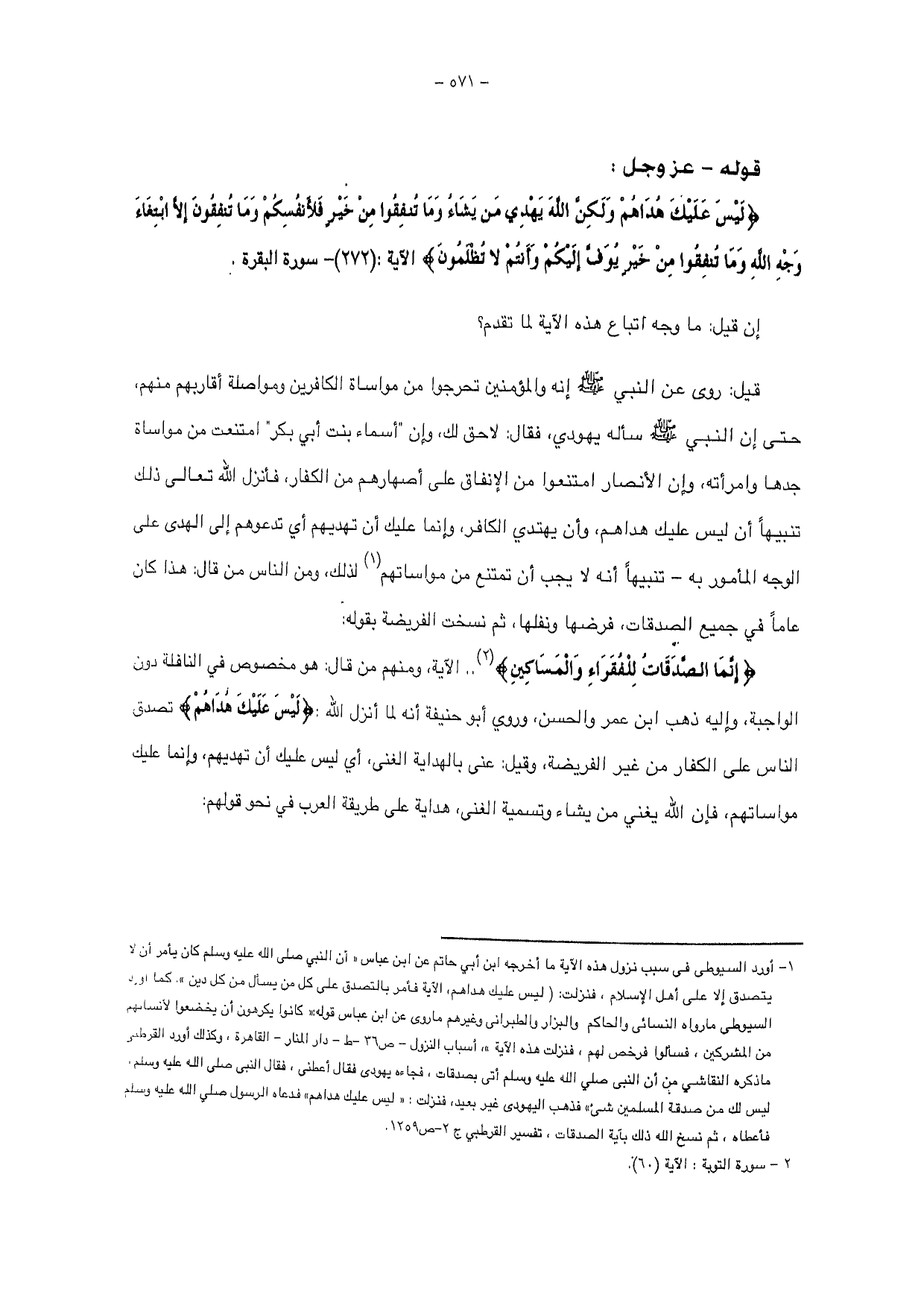 قيل: روى عن النبي - صلى الله عليه وسلم - إنه والمؤمنين تحرجوا من مواساة الكافرين ومواصلة أقاربهم منهم، حتى إن النبي - صلى الله عليه وسلم - سأله يهودي فقال: لاحق لك وإن " أسماء بنت أبي بكر " امتنعت من مواساة جدها وامرأته، وإن الأنصار امتنعوا من الإنفاق على أصهارهم من الكفار فأنزل الله تعالى ذلك تنبيها أن ليس عليك هداهم وأن يهتدي الكافر وإنما عليك أن تهديهم أي تدعوهم إلي الهدى على الوجه المأمور به - تنبيهاً أنه لا يجب أن تمتنع من مواساتهم لذلك، ومن الناس من قال: هذا كان عاما في جميع الصدقات، فرضها ونفلها ثم نسخت الفريضة بقوله: {إِنَّمَا الصَّدَقَاتُ لِلْفُقَرَاءِ وَالْمَسَاكِينِ} الآية ومنهم من قال: هو مخصوص في النافلة دون الواجبة، وإليه ذهب ابن عمر والحسن، وروي أبو حنيفة أنه لما أنزل الله: {لَيْسَ عَلَيْكَ هُدَاهُمْ} تصدق الناس على الكفار من غير الفريضة، وقيل عنى بالهداية الغنى، أي ليس عليك أن تهديهم، وإنما عليك مواساتهم، فإن الله يغني من يشاء وتسمية الغنى، هداية على طريقة العرب في نحو قولهم: