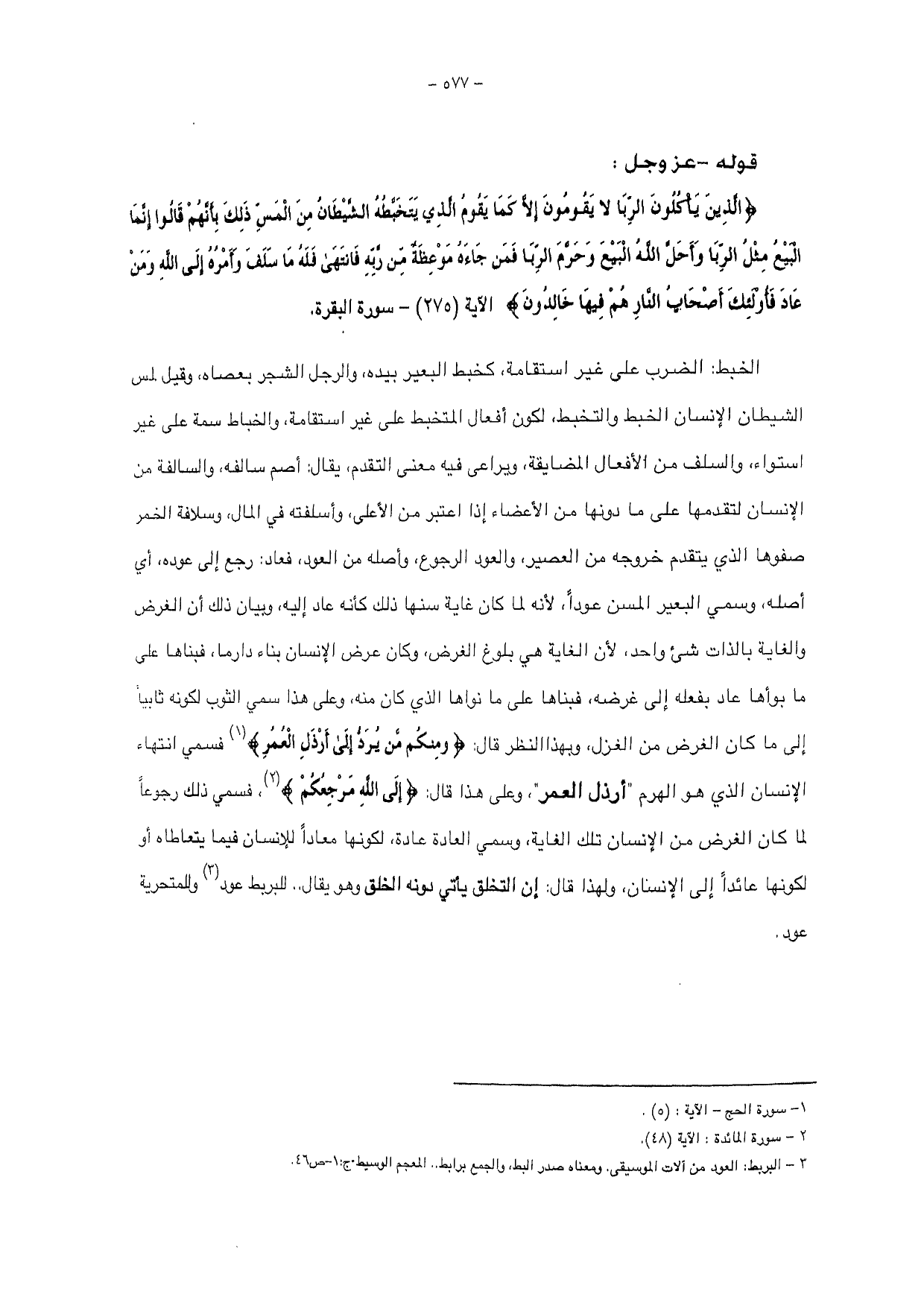 الخيط: الضرب على غير استقامة كخبط البعير بيده، والرجل الشجر بعصاه، وقيل لمس الشيطان الإنسان الخبط والتخبط لكون أفعال المتخبط على غير استقامة، والخباط سمة على غير استواء والسلف من الأفعال المضايقة) ويراعى سببه معنى التقدم، يقال: أصم سالفه، والسالفة من الإنسان لتقدمها علي ما دونها من الأعضاء إدا اعتبر من الأعلى، وأسلفته في المال، وسلافة الخمر صفوها الذي يتقدم خروجه من العصير، والعود الرجوع، وأصله من العود، فعاد رجع إلي عوده، أي أصله، وسمي البعير المسن عوداً، لأنه لما كان غاية سنها ذلك كأنه عاد إليه، وبيان ذلك أن الغرض والغاية بالذات شيء واحدا لأن الغاية هي بلوغ الغرض، وكان عرض الإنسان بناء دراما، فبناها علي ما بوأها عال بفعله إلى غرضه، فبناها على ما نواها الذي كان منه، وعلى هذا سمي الثوب لكونه ثابياً إلى ما كان الغرض من الغزل، وبهذا النظر قال: {وَمِنْكُمْ مَنْ يُرَدُّ إِلَى أَرْذَلِ الْعُمُرِ} فسمي انتهاء الإنسان الذي هو الهرم " أرذل العمر "، وعلى هذا قال: {إِلَى اللَّهِ مَرْجِعُكُمْ} فسمي ذلك رجوعاً لما كان الغرض من الإنسان تلك الغاية، وفي العادة عادة، لكونها معاداً للإنسان فيما يتعاطاه أو لكونها عائدا إلى الإنسان، ولهذا قال: إن التخلق يأتي دونه الخلق وهو يقال ...