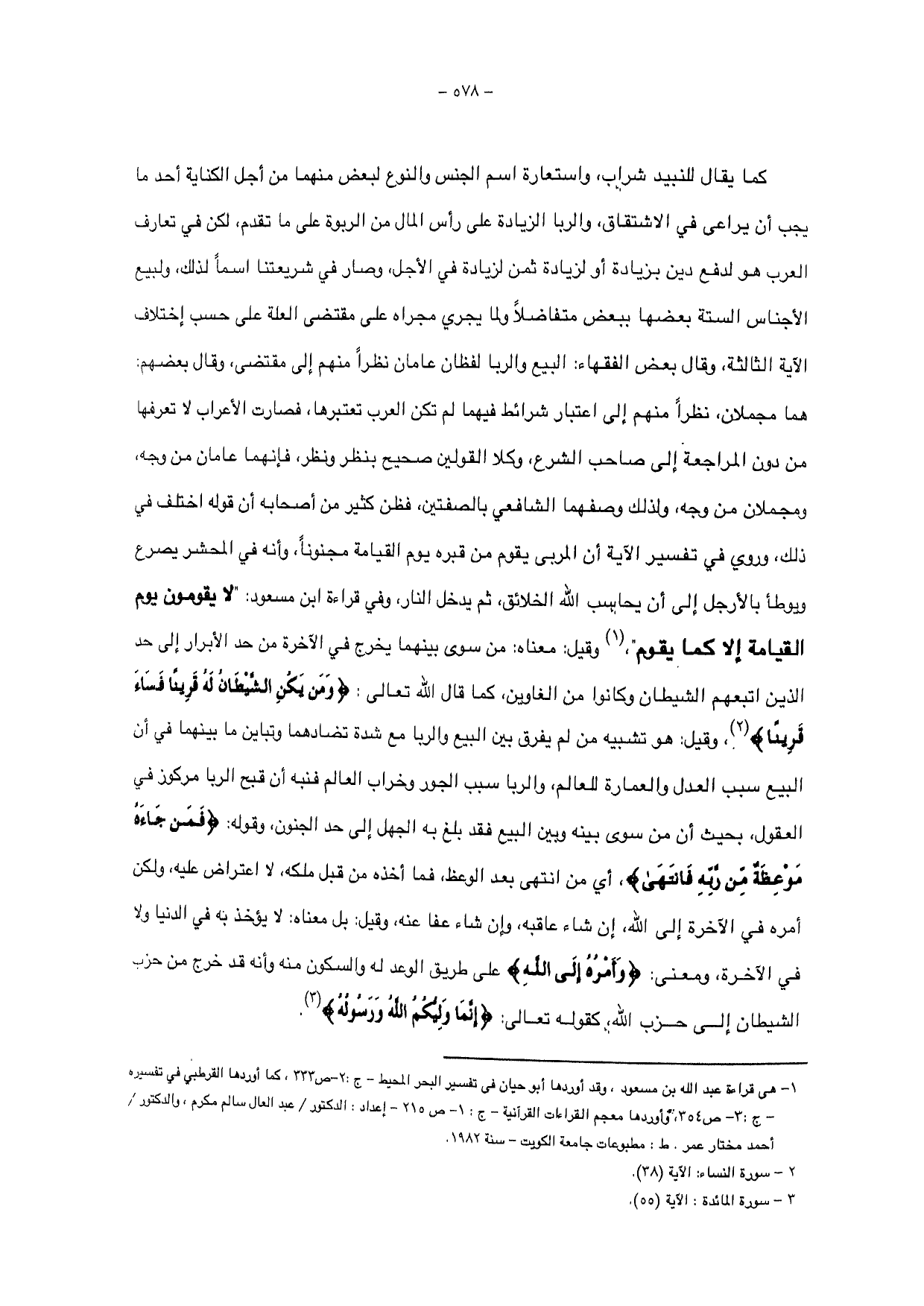 الآية الثالثة، وقال بعض الفقهاء: البيع والربا لفظان عامان نظرا منهم إلى مقتضى، وقال بعضهم: هما مجملان، نظرا منهم إلى اعتبار شرائط فيهما لم تكن العرب تعتبرها، فصارت الأعراب لا تعرفها من دون المراجعة إلى صاحب الشرع، وكلا القولين صحيح بنظر ونظر، فإنهما عامان من وجه، ومجملان من وجه، ولذلك وصفهما الشافعي بالصفتين، فظن كثير من أصحابه أن قوله اختلف في ذلك، وردي في تفسير الآية أن المربى يقوم من قبره يوم القيامة مجنوناً، وأنه في المحشر يصرع ويوطأ بالأرجل إلى أن يحاسب الله الخلائق، ثم يدخل النار، وفي قراءة ابن مسعود: " لا يقومون يوم القيامة إلا كما يقوم "، وقيل: معناه: من سوى بينهما يخرج في الآخرة من حد الأبرار إلى حال الدين اتبعهم الشيطان وكانوا من الغاوين، كما قال الله تعالى: {وَمَنْ يَكُنِ الشَّيْطَانُ لَهُ قَرِينًا فَسَاءَ قَرِينًا}، وقيل: هو تشبيه من لم يفرق بين البيع والربا مع شدة تضادهما وتباين ما بينهما في أن البيع سبب العدل والعمارة للعالم، والربا سبب الجور وخراب العالم فنبه أن قبح الربا مركوز في العقول، بحيث أنما من سوى بينه وبين البيع فقد بلغ به الجهل إلى حد الجنون، وقوله: {فَمَنْ جَاءَهُ مَوْعِظَةٌ مِنْ رَبِّهِ فَانْتَهَى}، أي من انتهى بعد الوعظ، فما أخذه من قبل ملكه، لا اعتراض عليه، ولكن أمره في الآخرة إلى الله، إن شاء عاقبه، وإن شاء عفا عنه، وقيل: بل معناه: لا يؤخذ به في الدنيا ولا في الآخرة، ومعنى: {وَأَمْرُهُ إِلَى اللَّهِ} على طريق الوعد له والسكون منه وأنه قد خرج من حزب الشيطان إلى حزب الله، كقوله تعالى: {إِنَّمَا وَلِيُّكُمُ اللَّهُ وَرَسُولُهُ}.