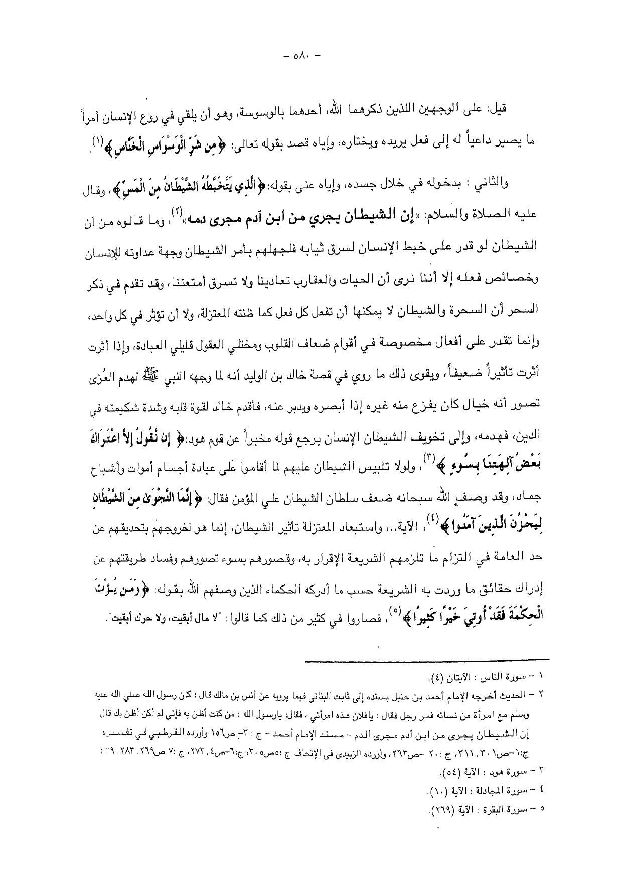 ، واستبعاد المعتزلة تأثير الشيطان، إنما هو لخروجهم بتحديقهم عن حد العامة في التزام ما تلزمهم الشريعة الإقرار به، وقصورهم بسوء تصورهم وفساد طريقتهم عن إدراك حقائق ما ورددت ما به الشريعة حسب ما أدركه الحكماء الذين وصفهم الله بقوله: {وَمَنْ يُؤْتَ الْحِكْمَةَ فَقَدْ أُوتِيَ خَيْرًا كَثِيرًا} فصاروا في كثير من ذلك كما قالوا: " لا مال أبقيت، ولا حرك أبقيت ".