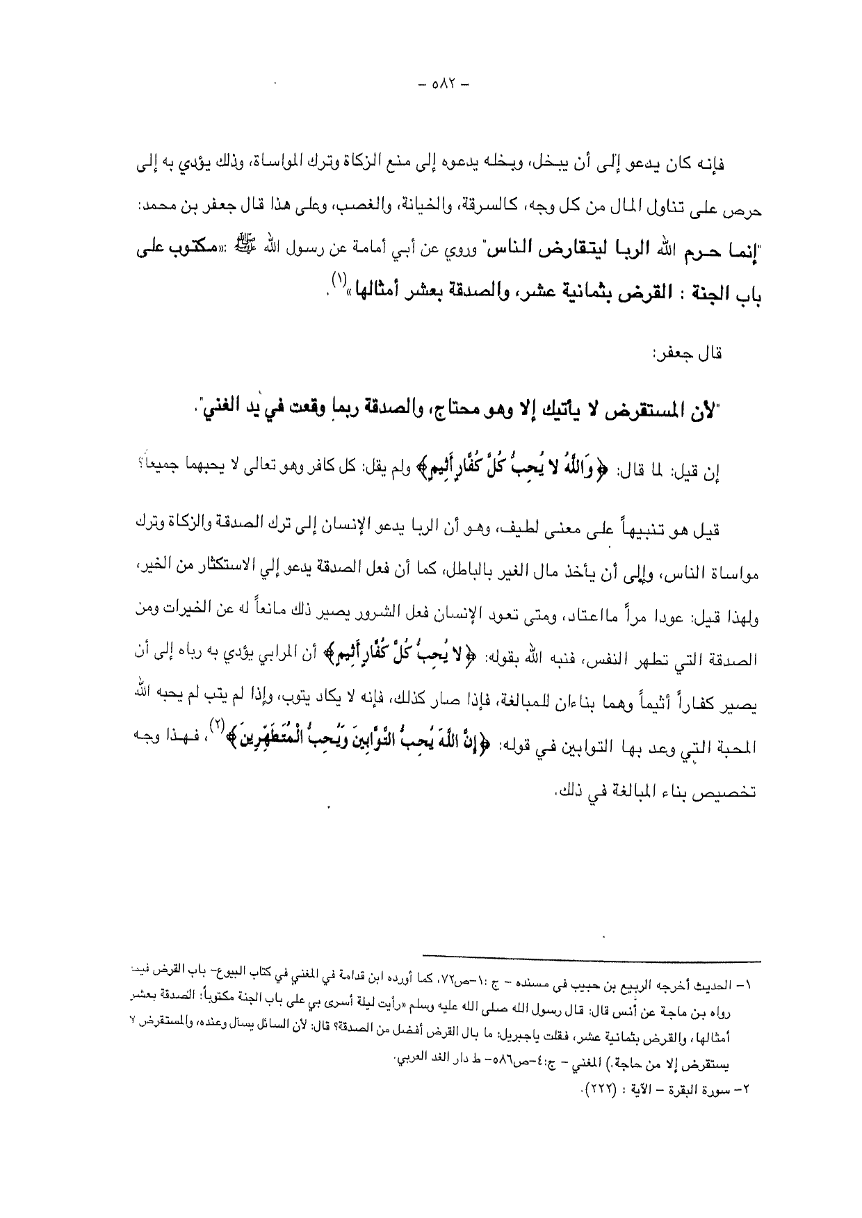 فإنه كان يدعو إلى أن يبخل وبخله يدعوه إلى منع الزكاة وترك المواساة، وذلك يؤدي به إلى حرص على تناول المال من كل وجه كالسرقة، والخيانة والغصب وعلى هذا قال جعفر بن محمد: " إنما حرم الله الربا ليتقارض الناس " وروي عن أبي أمامة عن رسول الله - صلى الله عليه وسلم -: " مكتوب على باب الجنة: القرض بثمانية عشر، والصدقة بعشر أمثالها ".