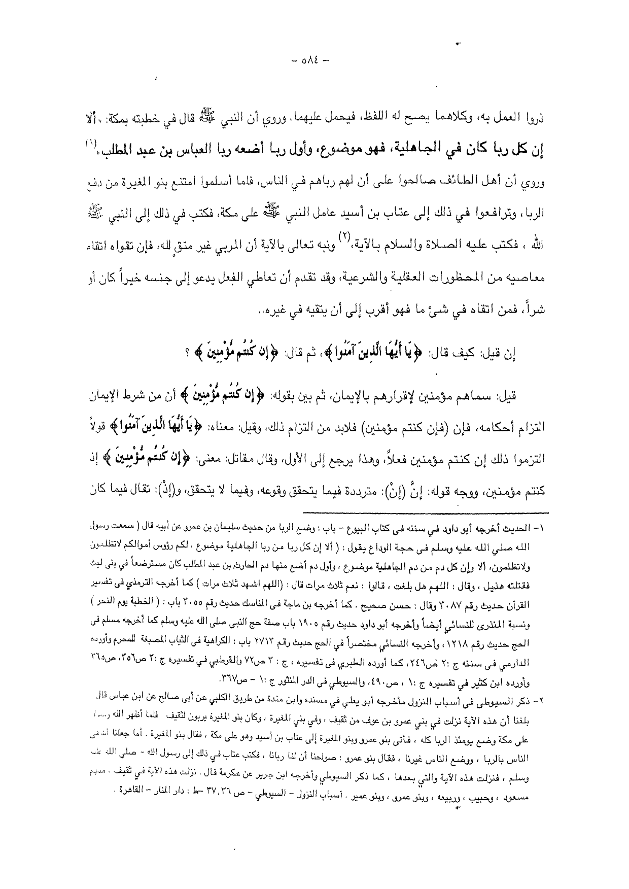ذروا العمل به، وكالاهما يصح له اللفظ، فيحمل عليهما وروي أن النبي - صلى الله عليه وسلم - قال في خطبته بمكة: " ألا إن كل ربا كان في الجاهلية، فهو موضوع، وأول ربا أضعه ربا العباس بن عبد المطلب " وروي أن أهل الطائف صالحوا على أن لهم رباهم في الناس، فلما أسلموا امتنع بنو المغيرة من دفع الربا، وترافعوا في ذلك إلى عتاب بن أسيد عامل النبي - صلى الله عليه وسلم - على مكة، فكتب في ذلك إلى النبي - صلى الله عليه وسلم - الله، فكتب عليه الصلاة والسلام بالآية، ونبه تعالى بالآية أن المربي غير متق لله، فإن تقواه اتقاء معاصيه من المحظورات العقلية والشرعية، وقد تقدم أن تعاطي الفعل يدعو إلى جنسه خيرا كان أو شرا، فمن اتقاه في شيء ما فهو أقرب إلى أن يتقيه في غيره ..