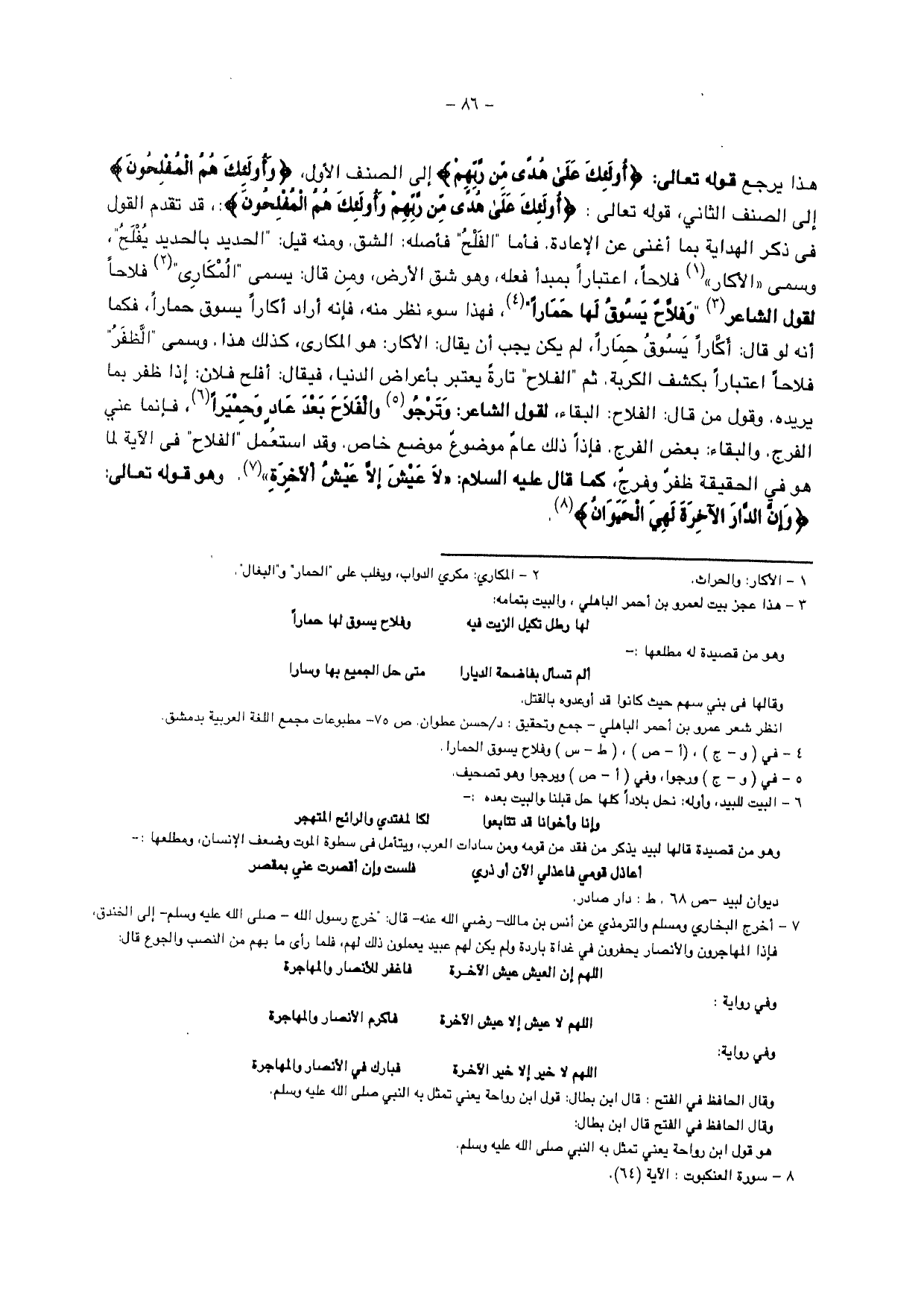وقد استعمل " الفلاح " في الآية لما هو في الحقيقة ظفر وفرج، كما قال عليه السلام: " لا عيش إلا عيش الآخرة " وهو قوله تعالى: {وَإِنَّ الدَّارَ الْآخِرَةَ لَهِيَ الْحَيَوَانُ}.
