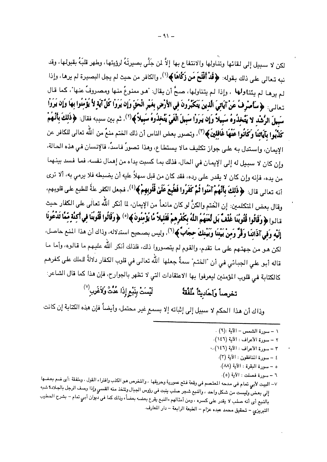 كان لا سبيل إلى لقائها وتناولها والانتفاع بها إلا لمن جلى بصيرته لرؤيتها، وطهر قلبه بقبولها، وقد نبه تعالى على ذلك بقوله: {قَدْ أَفْلَحَ مَنْ تَزَكَّى} والكافر من حيث لم يجل البصيرة لم يرها، وإذا لم يرها لم يتناولها، وإذا لم يتناولها، صح أن يقال: " هو ممنوع منها ومصروف عنها "، كما قال تعالى: {سَأَصْرِفُ عَنْ آيَاتِيَ الَّذِينَ يَتَكَبَّرُونَ فِي الْأَرْضِ بِغَيْرِ الْحَقِّ وَإِنْ يَرَوْا كُلَّ آيَةٍ لَا يُؤْمِنُوا بِهَا وَإِنْ يَرَوْا سَبِيلَ الرُّشْدِ لَا يَتَّخِذُوهُ سَبِيلًا وَإِنْ يَرَوْا سَبِيلَ الْغَيِّ يَتَّخِذُوهُ سَبِيلًا} ثم بين سببه فقال: {ذَلِكَ بِأَنَّهُمْ كَذَّبُوا بِآيَاتِنَا وَكَانُوا عَنْهَا غَافِلِينَ} وتصور بعض الناس أن ذلك الختم منع من الله تعالى للكافر عن الإيمان، واستدل به على جواز تكليف ما لا يستطاع، وهذا تصور فاسد، فالإنسان في هذه الحالة، وإن كان لا سبيل له إلى الإيمان في الحال، فذلك بما كسبت يداه من إهمال نفسه، فما فسد بينهما من يده، فإنه وإن كان لا يقدر على رده، فقد كان من قبل سهلاً عليه أن يضبطه فلا يرمي به، ألا ترى أنه تعالى قال: {ذَلِكَ بِأَنَّهُمْ آمَنُوا ثُمَّ كَفَرُوا فَطُبِعَ عَلَى قُلُوبِهِمْ} فجعل الكفر علة للطبع على قلوبهم، وقال بعض المتكلمين: إن الختم والكن لو كان مانعاً من الإيمان، لما أنكر الله تعالى على الكفار حيث قالوا {وَقَالُوا قُلُوبُنَا غُلْفٌ بَلْ لَعَنَهُمُ اللَّهُ بِكُفْرِهِمْ فَقَلِيلًا مَا يُؤْمِنُونَ} {وَقَالُوا قُلُوبُنَا فِي أَكِنَّةٍ مِمَّا تَدْعُونَا إِلَيْهِ وَفِي آذَانِنَا وَقْرٌ وَمِنْ بَيْنِنَا وَبَيْنِكَ حِجَابٌ} وليس بصحيح استدلاله، وذاك أن هذا المنع حاصل، لكن هو من جهتهم على ما تقدم، والقوم لم يتصوروا ذلك، فلذلك أنكر الله عليهم ما قالوه، وأما ما قاله أبو علي الجبائي في أن " الختم " سمة جعلها الله تعالى في قلوب الكفار دلالة للملك على كفرهم كالكتابة في قلوب المؤمنين ليعرفوا بها الاعتقادات التي لا تظهر بالجوارح، فإن هذا كما قال الشاعر: