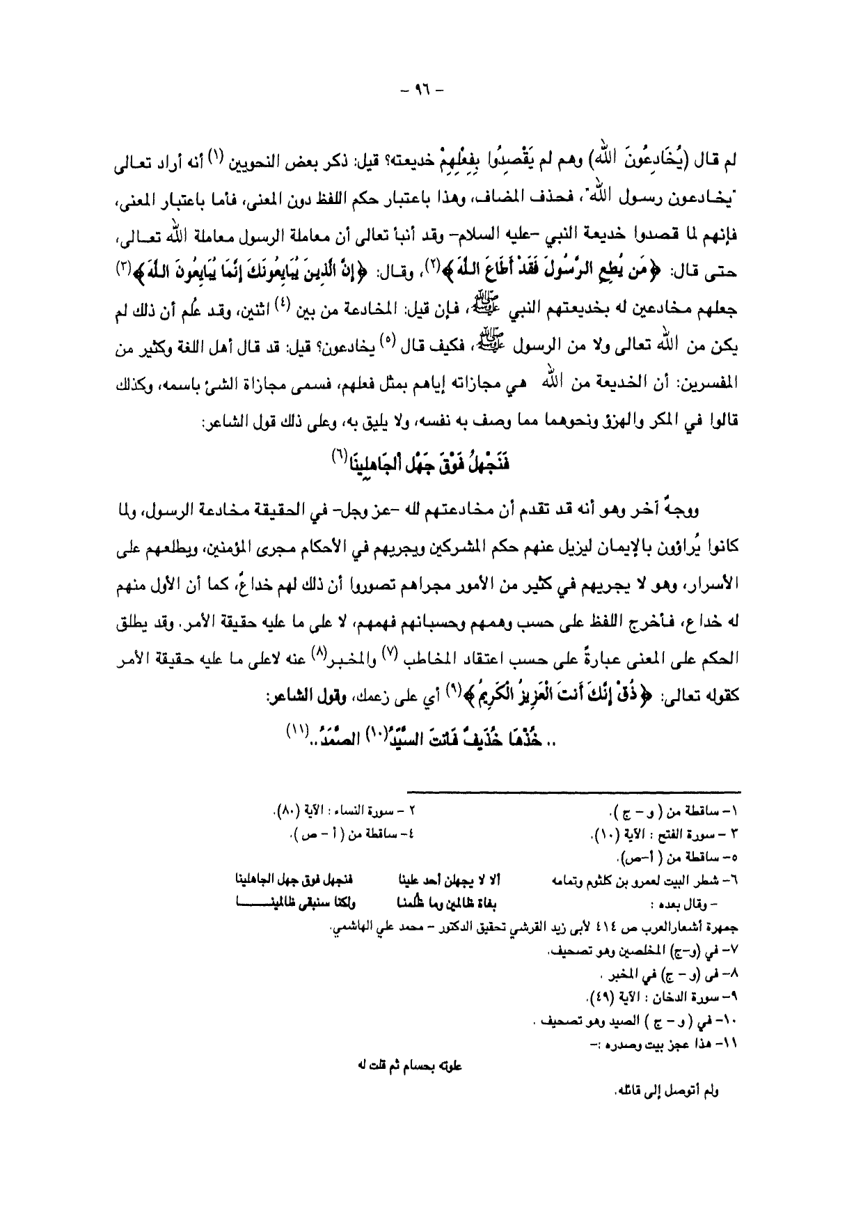 لم قال (يخادعون الله) وهم لم يقصدوا بفعلهم خديعته؟ قيل: ذكر بعض النحويين أنه أراد تعالى " يخادعون رسول الله "، فحذف المضاف، وهذا باعتبار حكم اللفظ دون المعنى فأما باعتبار المعنى فإنهم لما قصدوا خديعة النبي - عليه السلام - وقد أنبأ تعالى أن معاملة الله تعالى، حتى قال: {مَنْ يُطِعِ الرَّسُولَ فَقَدْ أَطَاعَ اللَّهَ} وقال: {إِنَّ الَّذِينَ يُبَايِعُونَكَ إِنَّمَا يُبَايِعُونَ اللَّهَ} جعلهم مخادعين له بخديعتهم النبي - صلى الله عليه وسلم -،
