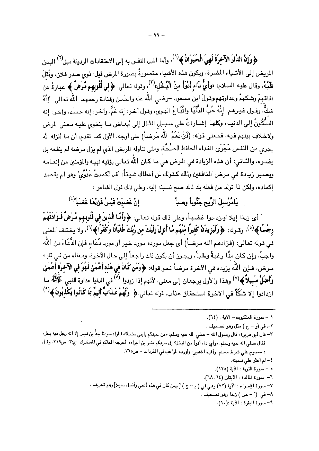 {وَإِنَّ الدَّارَ الْآخِرَةَ لَهِيَ الْحَيَوَانُ}، وأما الميل النفي به إلى الاعتقادات الرديئة ميل البدن المريض إلى الأشياء المضرة، ويكون هذه الأشياء بصورة المرض قيل: ذوي صدر فلان، ونقل قلبه، وقال عليه السلام: " وأي داء أدوأ من البخل "، وقوله تعالى: {في قلوبهم مرض} عبارة عن نفاقهم وشكهم وعداوتهم، وقول ابن مسعود - رضي الله عنه والحسن وقتادة رحمهما الله تعالى: " إنه شك، وقول غيرهم: إنه حب الدنيا واتباع الهوى، وقول آخر: إنه غم وآخر: إنه حسد، وآخر: إنه السكون إلى الدنيا، وكلها إشارات على سبيل المثال إلى أبغاض ما ينطوي عليه معنى المرض ولا خلاف بينهم فيه، فمعنى قوله: {فَزَادَهُمُ اللَّهُ مَرَضًا} على أوجه، الأول كما تقدم: أن ما أنزله الله يجري من النفس مجرى الغذاء الحافظ للصحة، ومتى تناوله المريض الذي لم يزل مرضه لم ينفعه بل يضره، والثاني: أن هذه الزيادة في المرض هي ما كان الله تعالى يؤتيه نبيه والمؤنين من إنعامه ويصير زيادة في مرض المنافقين وذلك كقولك لمن أعطاك شيئاً: " قد أكمدت عدوي وهو لم يقصج إكماده، ولكن لما تولد من فعله بك ذلك صح نسبته إليه، وعلى ذلك قوله الشاعر: