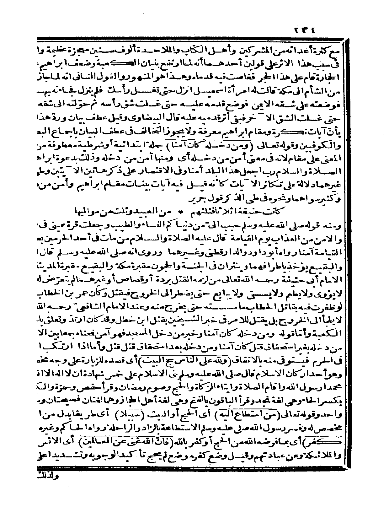 وروي أنه صلى الله عليه وسلم قال: «الحجون والبقيع يؤخذا بأطرافهما وينثران في الجنة» والحجون مقبرة مكة والبقيع مقبرة المدينة. وعند الإمام أبي حنيفة رحمه الله تعالى: من لزمه القتل بردة أو قصاص أو غيرهما لم يتعرّض له إلا أنه لا يؤوى ولا يطعم ولا يسقى ولا يبايع حتى يضطر إلى الخروج فيقتل، وكان عمر بن الخطاب يقول: لو ظفرت فيه بقاتل الخطاب ما مسسته حتى يخرج منه، وعند الإمام الشافعيّ رحمه الله تعالى: لا يلجأ إلى الخروج بل يقتل للأمر في خبر الشيخين بقتل ابن خطل وقد كان ارتدّ وتعلق بأستار الكعبة وأمّا قوله: ومن دخله كان آمناً وخبر من دخل المسجد فهو آمن فمعناه جمعاً بين الأدلة أنّ من دخله بغير استحقاق قتل كان آمناً، ومن دخله بعد استحقاق قَتل قُتل، وأما إذا ارتكب الجريمة في الحرم فيستوفى منه بالإتفاق {وعلى الناس حج البيت} أي: قصده للزيارة على وجه مخصوص وهو أحد أركان الإسلام، قال صلى الله عليه وسلم «بني الإسلام على خمس شهادة أن لا إله إلا الله وأنّ محمداً رسول الله وإقام الصلاة وإيتاء الزكاة والحج وصوم رمضان» وقرأ حفص وحمزة والكسائي بكسر الحاء وهي لغة نجد وقرأ الباقون بالفتح وهي لغة أهل الحجاز وهما لغتان فصيحتان ومعناهما واحد وقوله تعالى: {من استطاع إليه} أي: الحج أو البيت {سبيلاً} أي: طريقاً بدل من الناس مخصص له «وفسر رسول الله صلى الله عليه وسلم الإستطاعة بالزاد والراحلة» رواه الحاكم وغيره {ومن كفر} أي: بما فرضه الله من الحج أو كفر بالله {فإنّ الله غني عن العالمين} أي: الإنس والجنّ والملائكة وعن عبادتهم وقيل: وضع كفر موضع لم يحج تأكيداً لوجوبه وتشديداً على تاركه