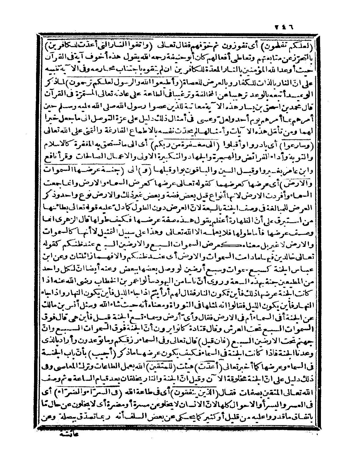 فإن قيل: قال تعالى: {وفي السماء رزقكم وما توعدون} وأراد بالذي وعدنا الجنة فإذا كانت الجنة في السماء فكيف يكون عرضها ما ذكر؟ أجيب: بأنّ باب الجنة في السماء وعرضها كما أخبر تعالى: {أعدّت} هيئت {للمتقين} الله بعمل الطاعات وترك المعاصي وفي ذلك دليل على أنّ الجنة مخلوقة الآن وقيل: إنّ الجنة والنار يخلقان بعد قيام الساعة.
