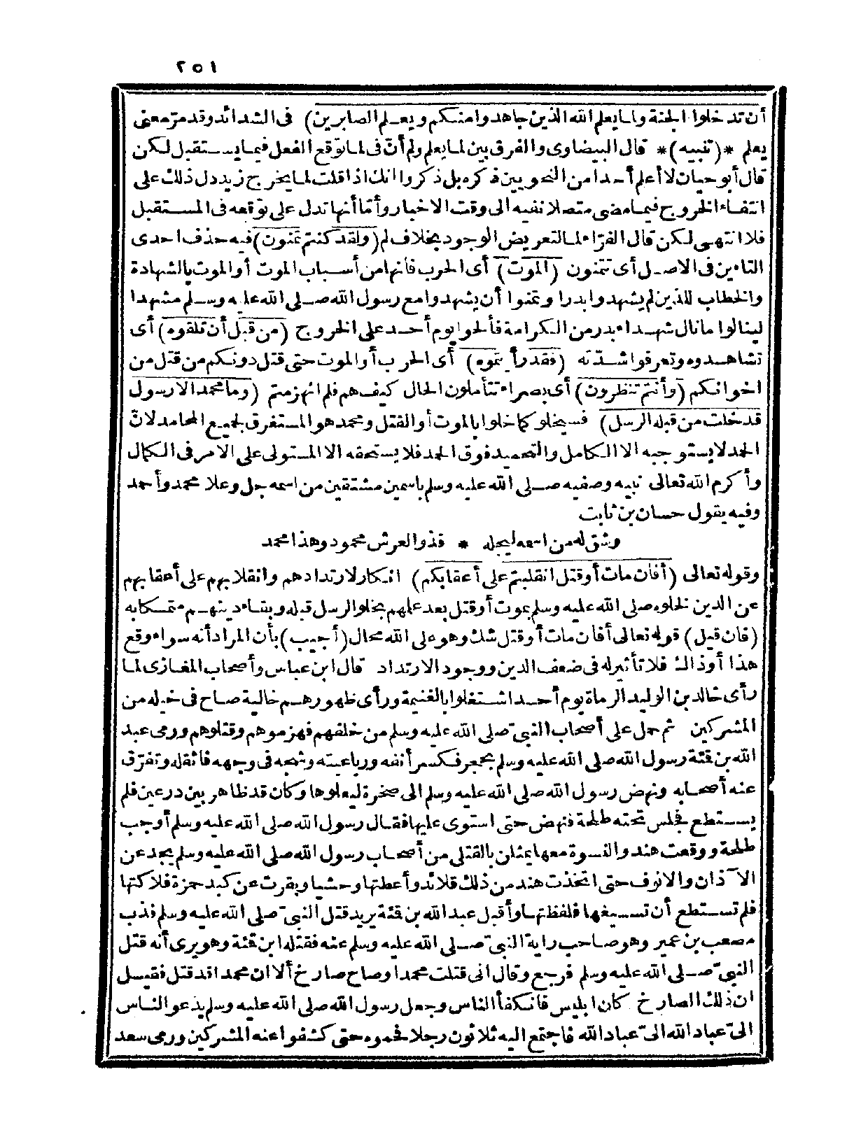 {وما محمد إلا رسول قد خلت من قبله الرسل} فسيخلو كما خلوا بالموت أو القتل ومحمد هو المستغرق لجميع المحامد؛ لأنّ الحمد لا يستوجبه إلا الكافل والتحيمد فوق الحمد فلا يستحقه إلا المستولي على الأمر في الكمال وأكرم الله تعالى نبيه وصفيه صلى الله عليه وسلم باسمين مشتقين من اسمه جل وعلا محمد وأحمد وفيه يقول حسان بن ثابت:
