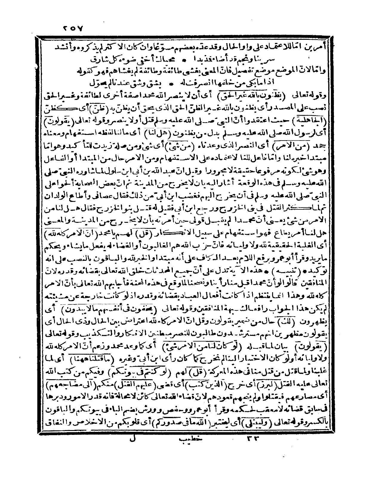 وقوله تعالى: {يظنون با غير الحق} أي: أن لا ينصر الله محمداً صفة أخرى لطائفة وغير الحق نصب على المصدر أي: يظنون بالله غير الظنّ الحق الذي يحق أن يظنّ به {ظنّ} أي: كظنّ {الجاهلية} حيث اعتقدوا أنّ النبيّ صلى الله عليه وسلم قتل أو لا ينصر وقوله تعالى: {يقولون} أي: لرسول الله صلى الله عليه وسلم بدل من يظنون {هل لنا} أي: ما لنا لفظه استفهام ومعناه جحد {من الأمر} أي: النصر الذي وعدناه {من شيء} أي: شيء ومن صلة زيدت للتأكيد وهو إمّا مبتدأ خبره لنا وإمّا فاعل للنا لاعتماده على الإستفهام ومن الأمر حال من المبتدأ أو الفاعل وهو شيء لكونه مرفوعاً حقيقة لا مجروراً، وقيل: إنّ عبد الله بن أبيا بنُ سلول لما شاوره النبيّ صلى الله عليه وسلم في هذه الوقعة أشار إليه بأن لا يخرج من المدينة ثم إنّ بعض الصحابة ألحوا على النبيّ صلى الله عليه وسلم في أن يخرج إليهم فغضب ابن أبيّ من ذلك، فقال: عصاني وأطاع الولدان ثم لما كثر القتل في بني الخزرج ورجع ابن أبي فقيل له: قتل بنو الخزرج فقال: هل لنا من الأمر من شيء يعني أنّ محمداً لم يقبل قولي حين أمرته بأن لا يخرج من المدينة والمعنى: هل لنا أمر يطاع فهو استفهام على سبيل الإنكار {قل} لهم يا محمد {إنّ الأمر كله} أي: الغلبة الحقيقية لله ولأوليائه، فإنّ حزب الله هم الغالبون أو القضاء له يفعل ما يشاء ويحكم ما يريد، وقرأ أبو عمرو برفع اللام بعد الكاف على أنه مبتدأ والخبر لله والباقون بالنصب على أنه توكيد.l
