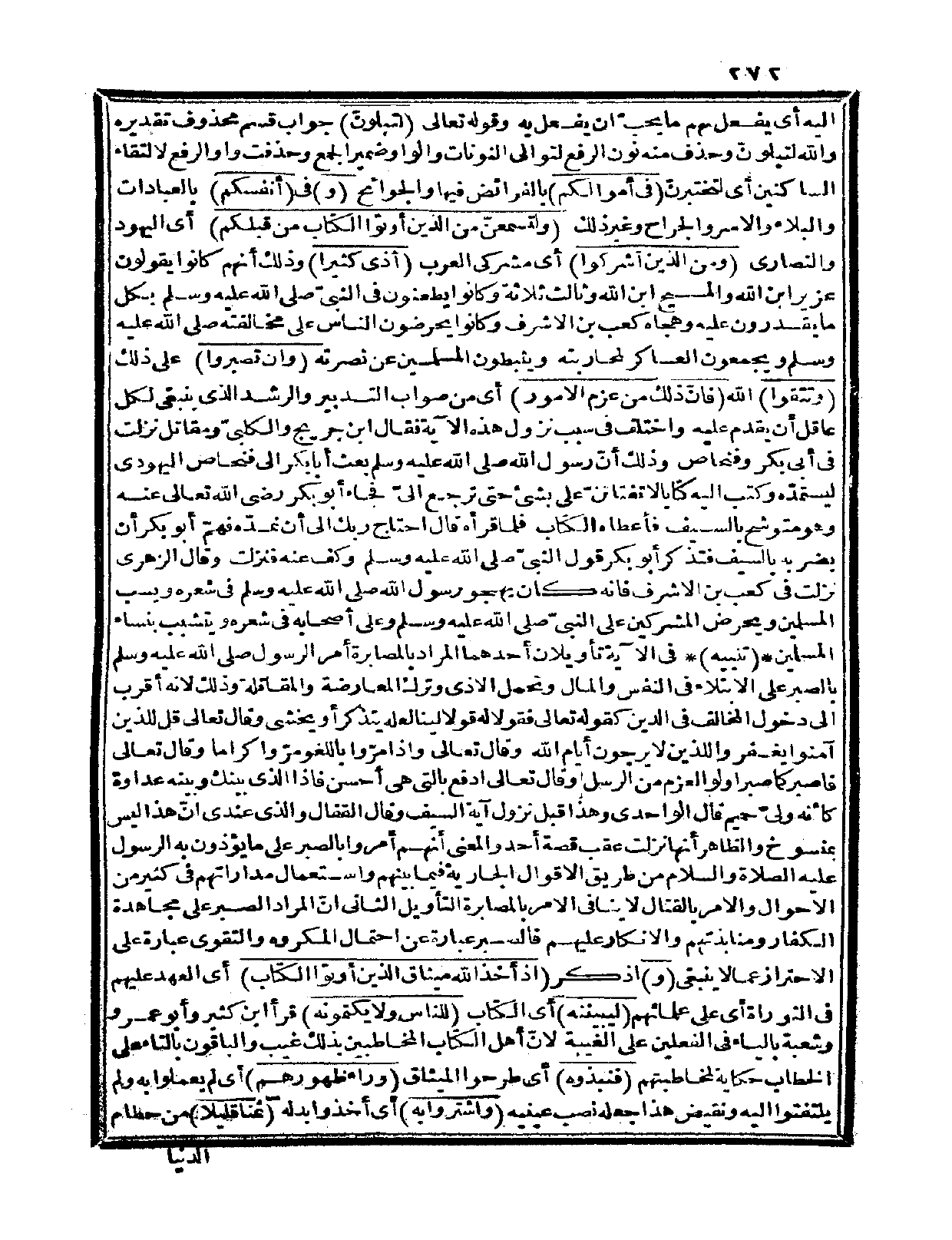 وقوله تعالى: {لتبلونّ} جواب قسم محذوف تقديره والله لنبلونّ وحذف منه نون الرفع لتوالي النونات والواو ضمير الجمع وحذفت واو الرفع لالتقاء الساكنين أي: لتختبرنّ {في أموالكم} بالفرائض فيها والجوائح {و} في {أنفسكم} بالعبادات والبلاء والأسر والجراح وغير ذلك {ولتسمعنّ من الذين أوتوا الكتاب من قبلكم} أي: اليهود والنصارى {ومن الذين أشركوا} أي: مشركي العرب {أذى كثيراً} وذلك أنهم كانوا يقولون: عزير ابن الله والمسيح ابن الله وثالث ثلاثة وكانوا يطعنون في النبيّ صلى الله عليه وسلم بكل ما يقدرون عليه وهجاه كعب بن الأشرف وكانوا يحرضون الناس على مخالفته صلى الله عليه وسلم ويجمعون العساكر لمحاربته ويثبطون المسلمين عن نصرته {وإن تصبروا} على ذلك {وتتقوا} الله {فإنّ ذلك من عزم الأمور} أي: من صواب التدبير والرشد الذي ينبغي لكل عاقل أن يقدم عليه، واختلف في سبب نزول هذه الآية، فقال ابن جريج والكلبيّ ومقاتل: نزلت في أبي بكر وفنحاص وذلك أنّ رسول الله صلى الله عليه وسلم بعث أبا بكر إلى فنحاص اليهودي ليستمدّه وكتب إليه كتاباً لا تفتاتنّ علي بشيء حتى ترجع إليّ فجاء أبو بكر رضي الله تعالى عنه وهو متوشح بالسيف فأعطاه الكتاب فلما قرأه قال: احتاج ربك إلى أن نمدّه فهمّ أبو بكر أن يضربه بالسيف فتذكر أبو بكر قول النبيّ صلى الله عليه وسلم وكف عنه، فنزلت وقال الزهري: نزلت في كعب بن الأشرف فإنه كان يهجو رسول الله صلى الله عليه وسلم في شعره ويسب المسلمين ويحرض المشركين على النبيّ صلى الله عليه وسلم وعلى أصحابه في شعره ويتشبب بنساء المسلمين.