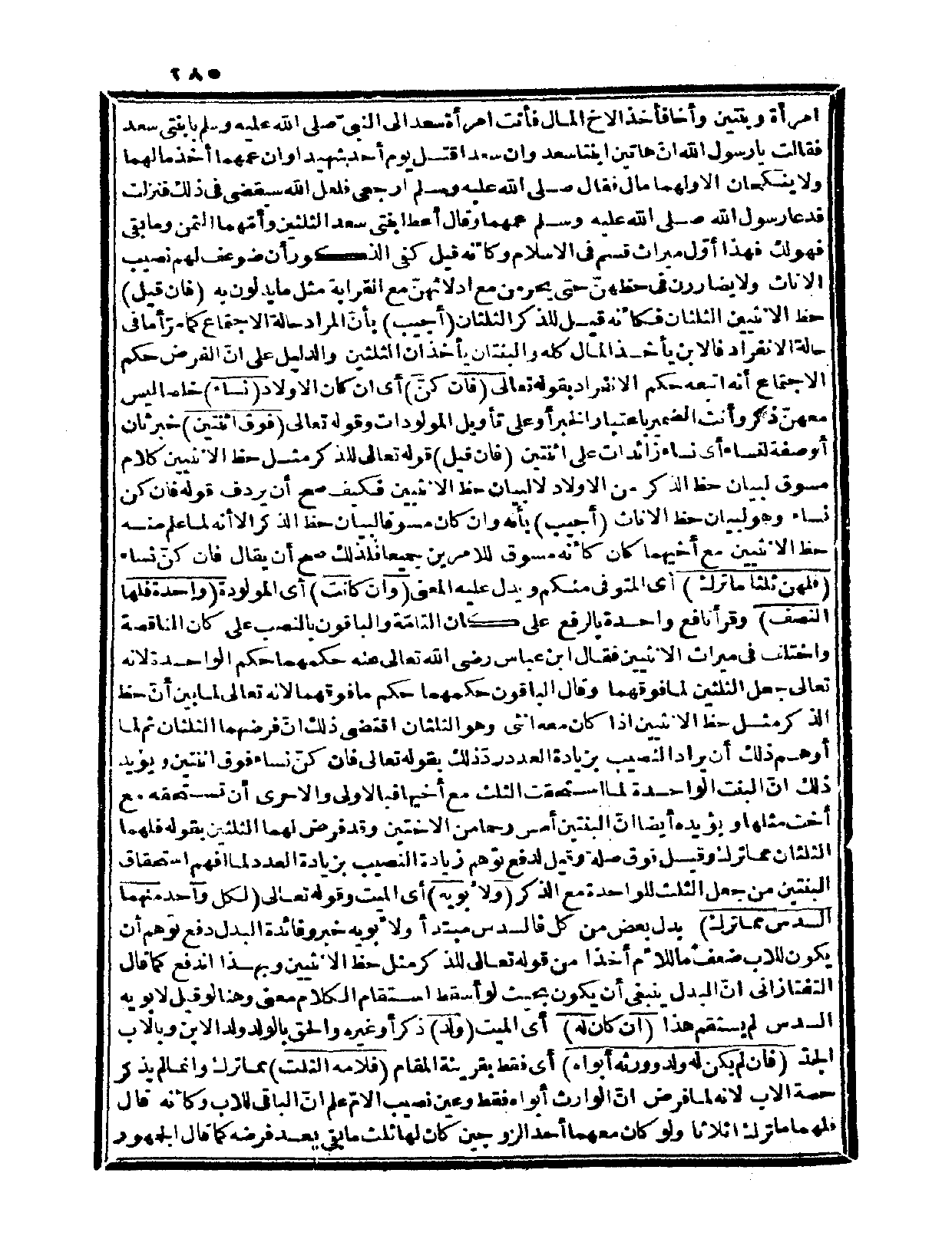 امرأة وبنتين وأخاً، فأخذ الأخ المال، فأتت امرأة سعد إلى النبيّ صلى الله عليه وسلم بابنتي سعد فقالت: يا رسول الله إنّ هاتين ابنتا سعد وإن سعداً قتل يوم أحد شهيداً وإن عمهما أخذ مالهما، ولا ينكحان إلا ولهما مال فقال صلى الله عليه وسلم «ارجعي فلعل الله سيقضي في ذلك» فنزلت، فدعا رسول الله صلى الله عليه وسلم عمهما وقال: «أعط ابنتي سعد الثلثين وأمّهما الثمن وما بقي فهو لك» فهذا أوّل ميراث قسم في الإسلام، وكأنه قيل: كفى الذكور أن ضوعف لهم نصيب الإناث، ولا يضارون في حظهنّ حتى يحرمن مع إدلائهنّ مع القرابة مثل ما يدلون به.