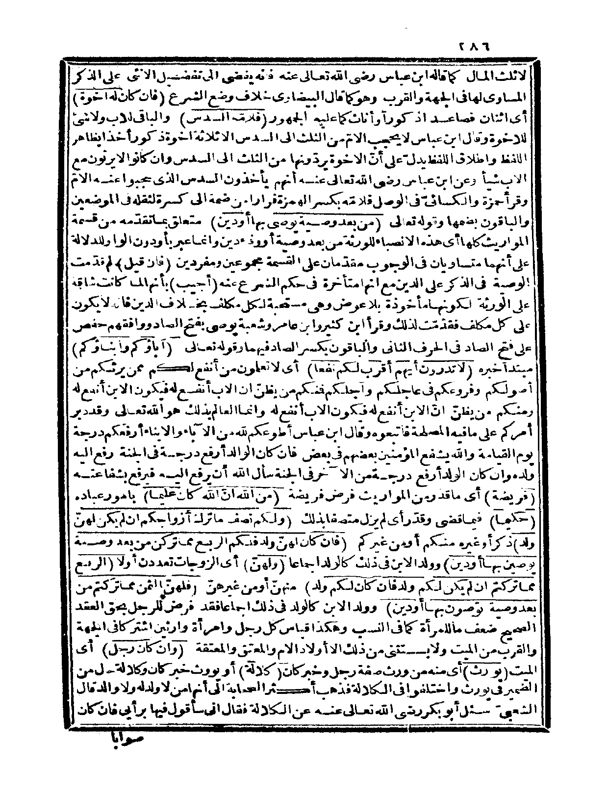 وقال ابن عباس: لا يحجب الأمّ من الثلث إلى السدس إلا ثلاثة إخوة ذكور، أخذاً بظاهر اللفظ، وإطلاق اللفظ يدلّ على أنّ الإخوة يردّونها من الثلث إلى السدس وإن كانوا لا يرثون مع الأب شيئاً، وعن ابن عباس رضي الله تعالى عنه أنهم يأخذون السدس الذي حجبوا عنه الأمّ.