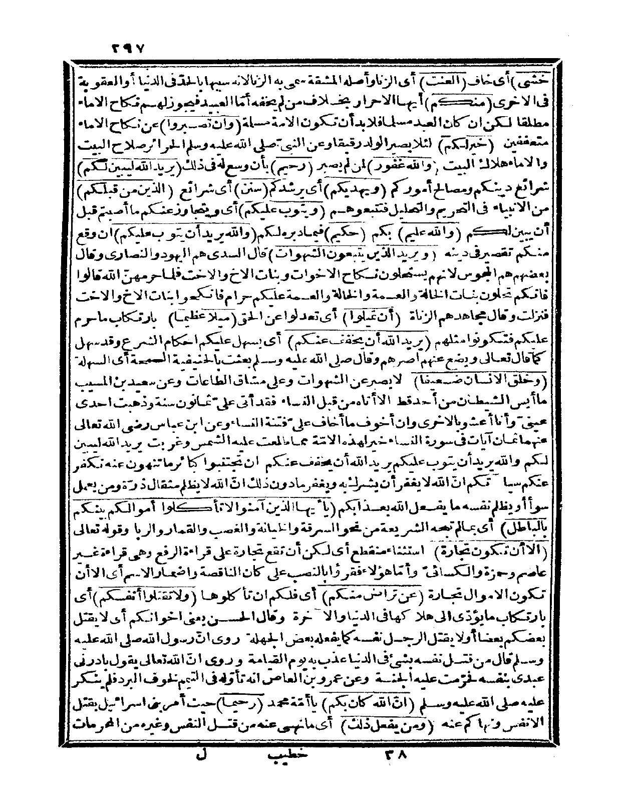 خشي} أي: خاف {العنت} أي: الزنا، وأصله المشقة سمي به الزنا؛ لأنه سببها بالحدّ في الدنيا أو العقوبة في الأخرى {منكم} أيها الأحرار بخلاف من لم يخفه أمّا العبيد فيجوز لهم نكاح الإماء مطلقاً لكن إن كان العبد مسلماً فلا بد أن تكون الأمة مسلمة {وإن تصبروا} عن نكاح الإماء متعففين {خير لكم} لئلا يصير الولد رقيقاً، وعن النبيّ صلى الله عليه وسلم «الحرائر صلاح البيت والإماء هلاك البيت» {وا غفور} لمن لم يصبر {رحيم} بأن وسع له في ذلك {يريد الله ليبين لكم} شرائع دينكم ومصالح أموركم {ويهديكم} أي: يرشدكم {سنن} أي: شرائع {الذين من قبلكم} من الأنبياء في التحريم والتحليل فتتبعوهم {ويتوب عليكم} أي: ويتجاوز عنكم ما أصبتم قبل أن يبين لكم {وا عليم} بكم {حكيم} فيما دبره لكم.