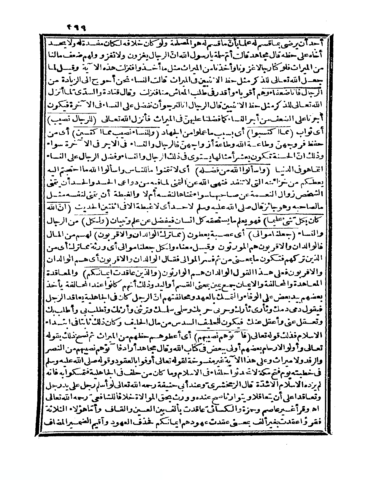 وقال قتادة والسديّ: لما أنزل الله تعالى للذكر مثل حظ الأنثيين قال الرجال: إنا لنرجو أن نفضل على النساء في الآخرة فيكون أجرنا على الضعف من أجر النساء كما فضلنا عليهنّ في الميراث فأنزل الله تعالى {للرجال نصيب} أي: ثواب {مما اكتسبوا} أي: بسبب ما عملوا من الجهاد {وللنساء نصيب ما اكتسبن} أي: من حفظ فروجهنّ وطاعة الله وطاعة أزواجهنّ، فالرجال والنساء في الأجر في الآخرة سواء، وذلك أنّ الحسنة تكون بعشر أمثالها يستوي في ذلك الرجال والنساء، وفضل الرجال على النساء إنما هو في الدنيا {واسألوا الله من فضله} أي: لا تتمنوا ما للناس واسألوا الله ما احتجتم إليه يعطكم من خزائنه التي لا تنفد، فنهى الله عن التمني لما فيه من دواعي الحسد والحسد، أن يتمنى الشخص زوال النعمة عن صاحبها سواء تمناها لنفسه أم لا، والغبطة أن يتمنى لنفسه مثل ما لصاحبه وهو جائز، قال صلى الله عليه وسلم «لا حسد ـ أي: لا غبطة ـ إلا في اثنتين» الحديث {إنّ الله كان بكلّ شيء عليماً} فهو يعلم ما يستحقه كل إنسان فيفضل عن علم وتبيان.