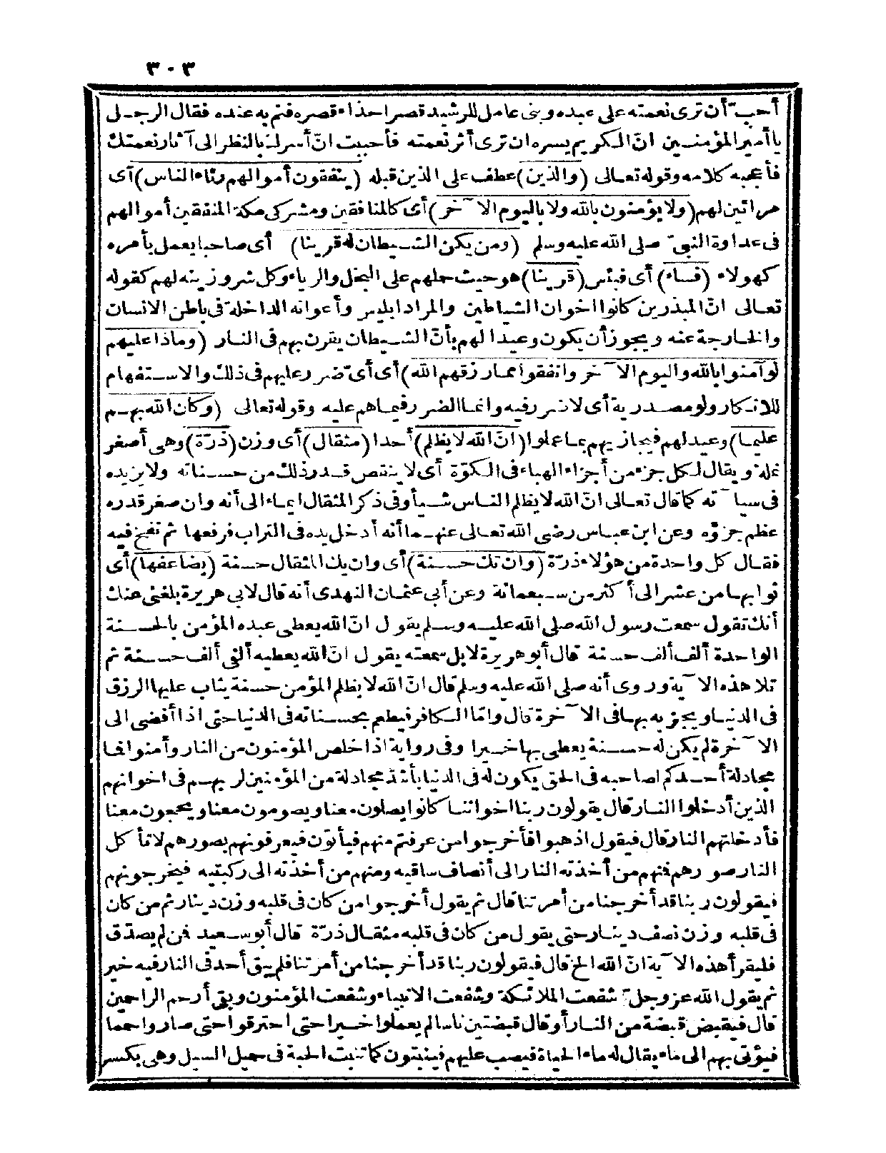 وروي أنه صلى الله عليه وسلم قال: «إنّ الله لا يظلم المؤمن حسنة يثاب عليها الرزق في الدنيا ويجزيه بها في الآخرة» قال: وأمّا الكافر فيطعم بحسناته في الدنيا حتى إذا أفضى إلى الآخرة لم يكن له حسنة يعطى بها خيراً. وفي رواية: «إذا خلص المؤمنون من النار وأمنوا فما مجادلة أحدكم لصاحبه في الحق يكون له في الدنيا بأشد مجادلة من المؤمنين لربهم في إخوانهم الذين أدخلوا النار، قال: يقولون: ربنا إخواننا كانوا يصلون معنا ويصومون معنا ويحجون معنا فأدخلتهم النار قال: فيقول اذهبوا فأخرجوا من عرفتم منهم فيأتون فيعرفونهم بصورهم لا تأكل النار صورهم فمنهم من أخذته النار إلى أنصاف ساقيه ومنهم من أخذته إلى ركبتيه فيخرجونهم فيقولون: ربنا قد أخرجنا من أمرتنا قال: ثم يقول: أخرجوا من كان في قلبه وزن دينار ثم من كان في قلبه وزن نصف دينار حتى يقول من كان في قلبه مثقال ذرّة، قال أبو سعيد: فمن لم يصدّق فليقرأ هذه {إنّ الله} إلخ.. قال: فيقولون ربنا قد أخرجنا من أمرتنا فلم يبق أحد في النار فيه خير ثم يقول الله عز وجل: شفعت الملائكة وشفعت الأنبياء وشفعت المؤمنون وبقي أرحم الراحمين قال: فيقبض قبضة من النار أو قال قبضتين ناساً لم يعملوا خيراً حتى احترقوا حتى صاروا حمماً فيؤتى بهم إلى ماء يقال له: ماء الحياة فيصب عليهم فينبتون كما تنبت الحبة في حميل السيل ـ وهي بكسر