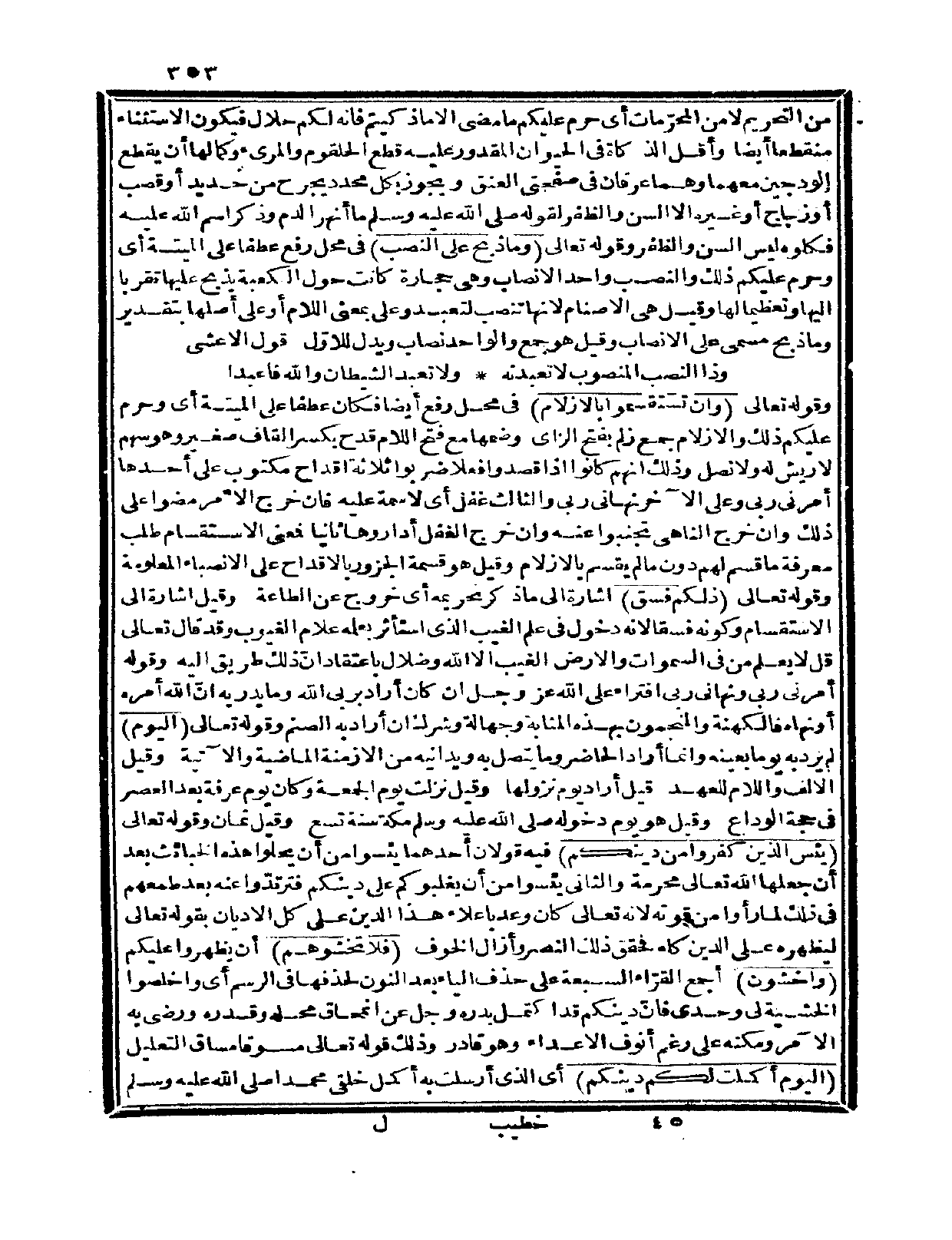 وقوله تعالى: {اليوم} لم يرد به يوماً بعينه وإنما أراد الحاضر وما يتصل به ويدانيه من الأزمنة الماضية والآتية، وقيل: الألف واللام للعهد، قيل: أراد يوم نزولها، وقيل: نزلت يوم الجمعة وكان يوم عرفة بعد العصر في حجة الوداع، وقيل: هو يوم دخوله صلى الله عليه وسلم مكة سنة تسع، وقيل: ثمان، وقوله تعالى: {يئس الذين كفروا من دينكم} فيه قولان أحدهما: يئسوا من أن يحلوا هذه الخبائث بعد أن جعلها الله تعالى محرمة، والثاني: يئسوا من أن يغلبوكم على دينكم فترتدّوا عنه بعد طمعهم في ذلك، لما رأوا من قوته؛ لأنه تعالى كان وعد بإعلاء هذا الدين على كل الأديان بقوله تعالى: {ليظهره على الدين كله} (التوبة، 33) فحقق ذلك النصر وأزلل الخوف {فلا تخشوهم} أن يظهروا عليكم {واخشون} أجمع القرّاء السبعة على حذف الياء بعد النون لحذفها في الرسم أي: واخلصوا الخشية لي وحدي فإنّ دينكم قد اكتمل بدره وجل عن انمحاق محله وقدره ورضي به الآمر ومكّنه على رغم أنوف الأعداء وهو قادر وذلك قوله تعالى مسوقاً مساق التعليل: